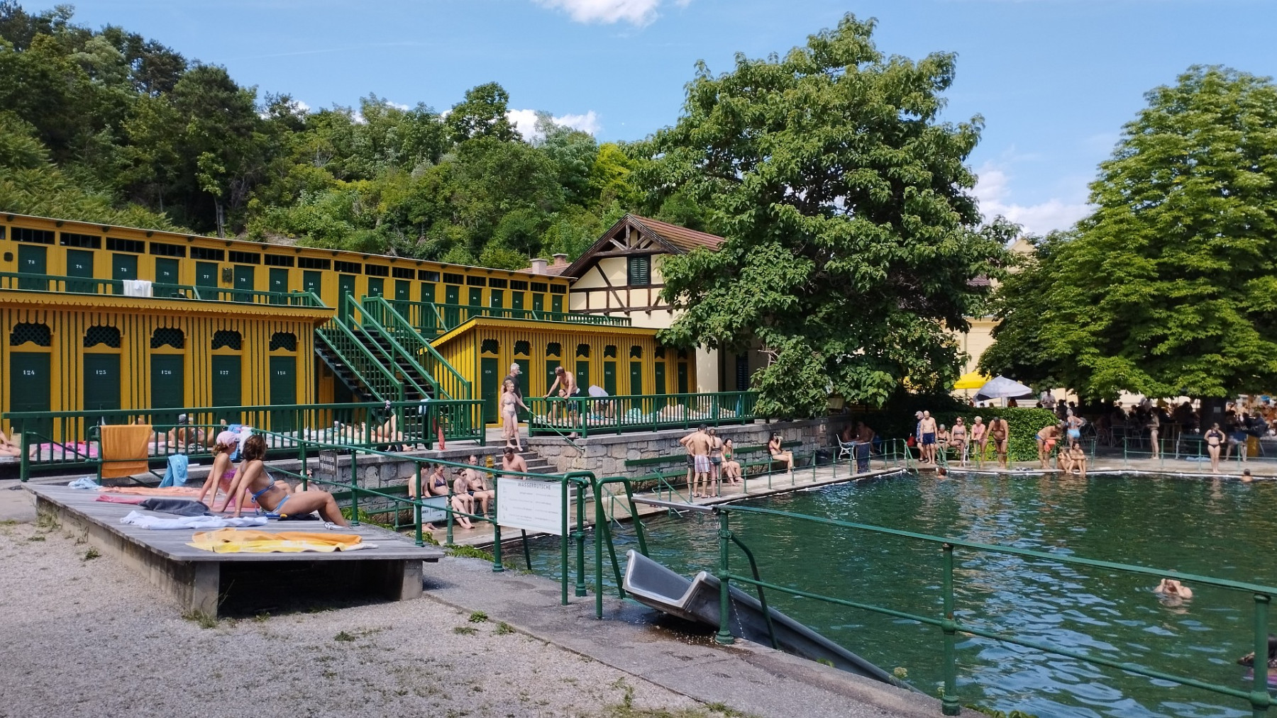 Die Wassertemperatur hat nach wie vor das ganze Jahr 19°C und liefert daher die perfekte Erfrischung. Der Einstieg ins Wasser ist immer eine Herausforderung, aber dann schafft man ohne weiteres einige (kurze) Längen. Ein gemütlicher Wiesenplatz im Schatten lässt sich auch finden, wenn man zeitig genug da ist.