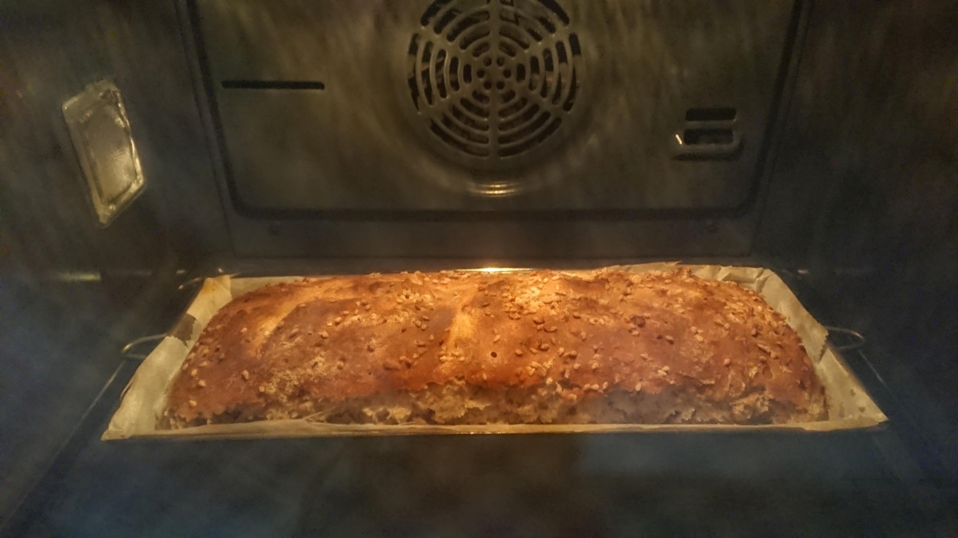 und den abgeseihten Sonnenblumenkernen in der Küchenmaschine auf „min“ geknetet. Nach 2 Stunden versucht zu falten, ging sehr gut. Der Teig war viel fester und ließ sich angreifen und mit den Händen Falten. Dann konnte ich ihn als Striezel in die Kastenform legen (wie immer mit ein paar Sesamkörnern) .