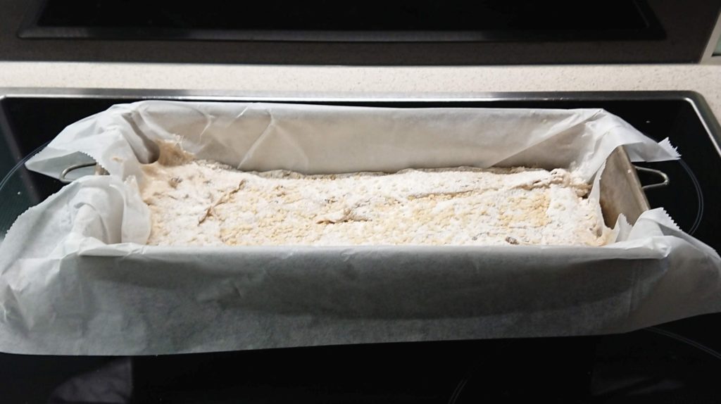 Nach ca. 2h wieder zu weich für vernünftiges Folding oder kneten. In die Kastenform verfrachtet und auf Backen mit Feuchtigkeit bei 300 Grad 10 min, ACHTUNG! bei 300 Grad wird überstehendes Backpapier schwarz und beginnt fast zu brennen! Dann bei 200 Grad 50 min.