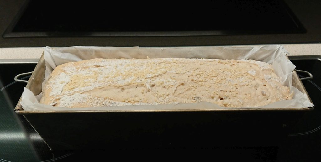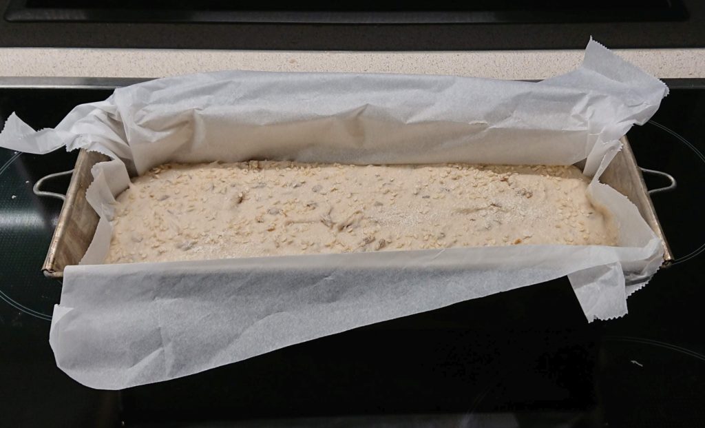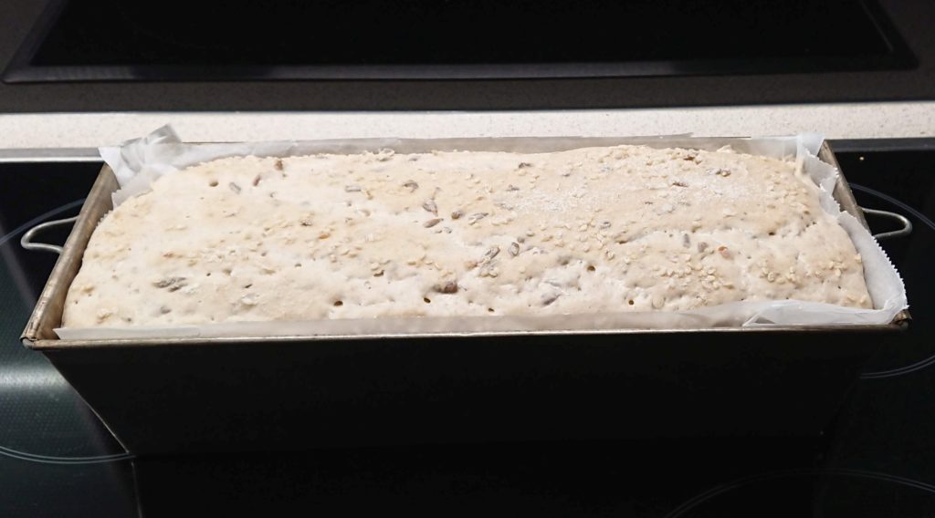 Heute Früh 400g Dinkelmehl 700 und 200ml Wasser dazu, sowie ca. 6 EL geröstete und ca. 1h eingeweichte Sonnenblumenkerne, 1EL Salz, 1EL Brotgewürz und Kümmel. In der Küchenmaschine auf „min“ geknetet und gleich in die Kastenform gefüllt.