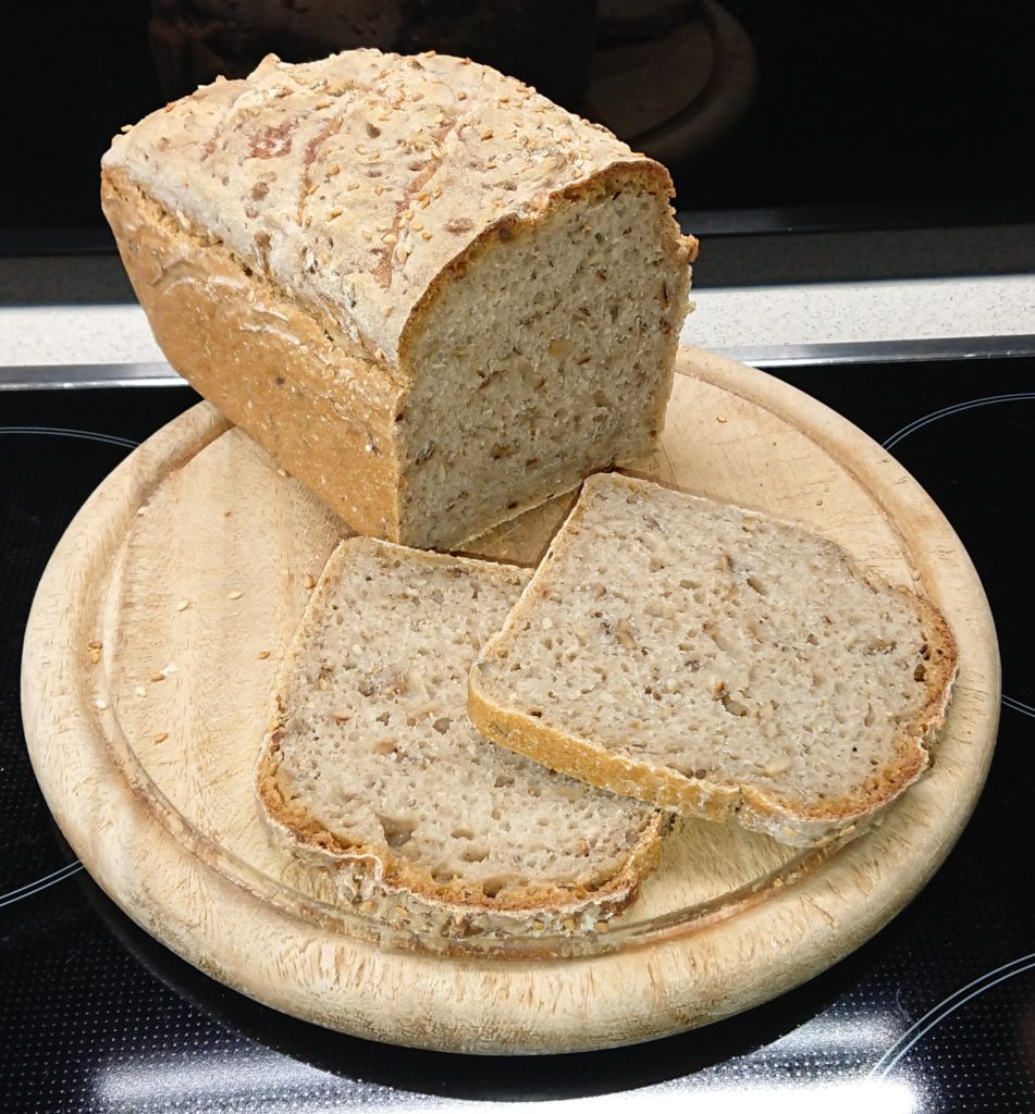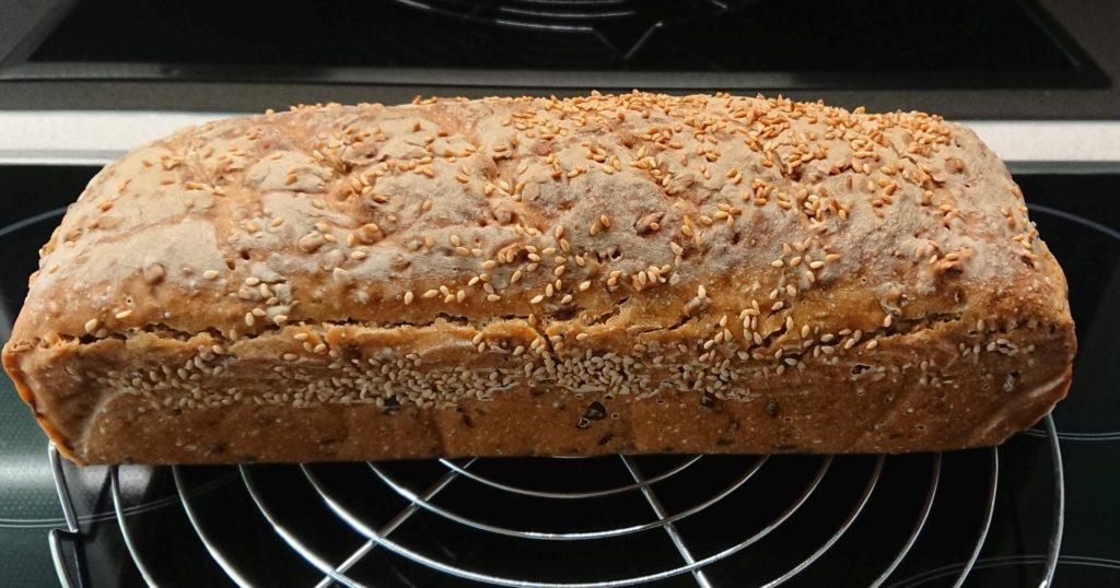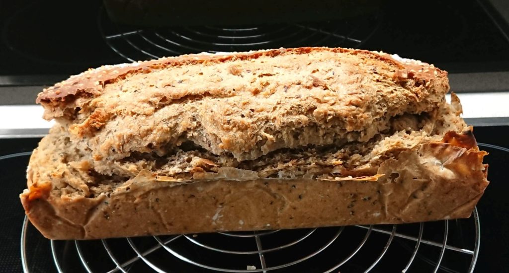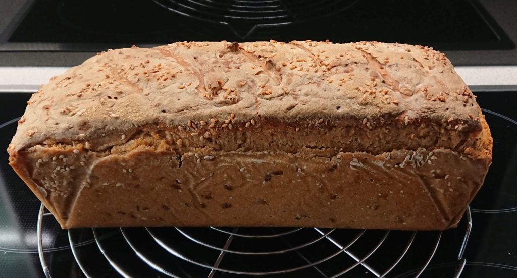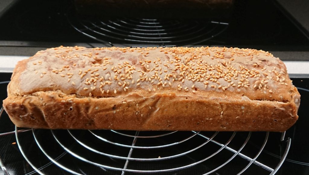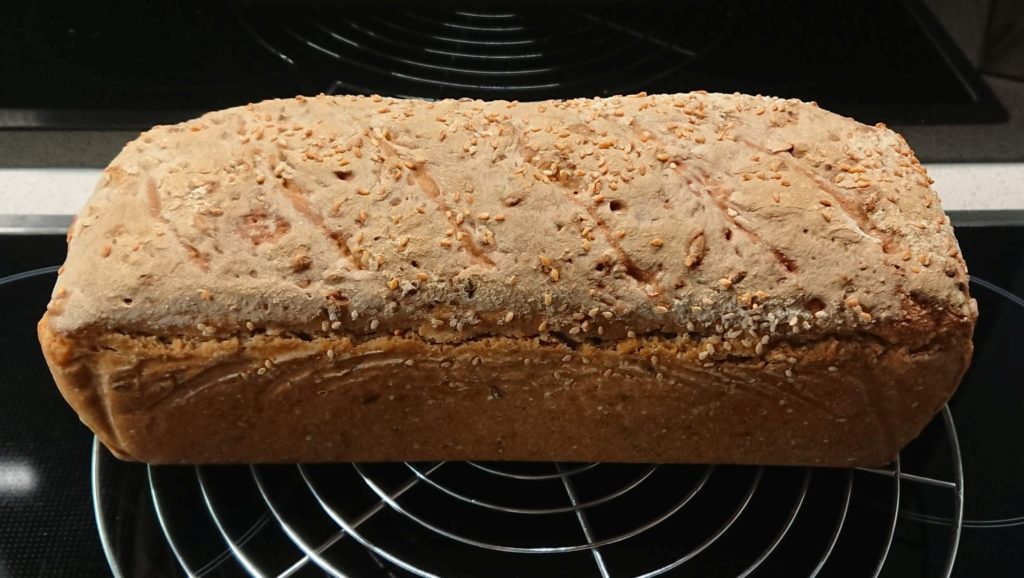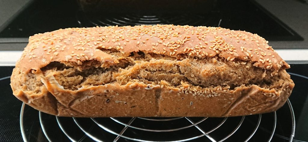 Heute früh 200g Dinkelmehl 700 und 100ml Wasser dazu, dann Brotgewürz und Salz (etwas weniger) , dazu die Sonnenblumenkerne. 3 Stunden in der Kastenform gehen lassen, davor ein paar Sesamkörner darüber. Auf 300 Grad vorheizen samt Metallschüssel, ein Schluck Wasser hinein 10min auf 300 Grad, dann Wasser raus und 25 min auf 200 Grad, dann raus aus der Form und auf 200 Grad 10 min ohne Form fertigbacken. Hab aber versehentlich auf „Backen mit Feuchtigkeit“ vergessen.