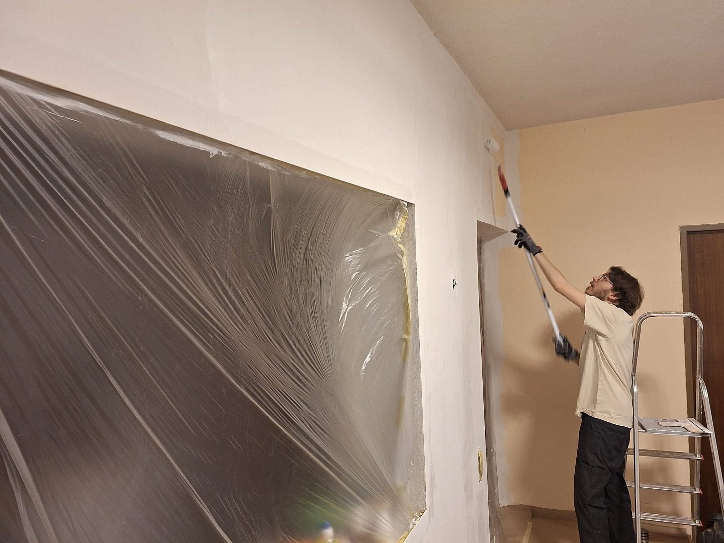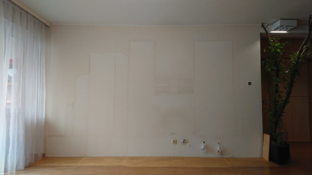 Dann die dahinter versteckte Wand komplett verspachteln und alle Wände neu streichen. Heute streicht man fast immer weiß.