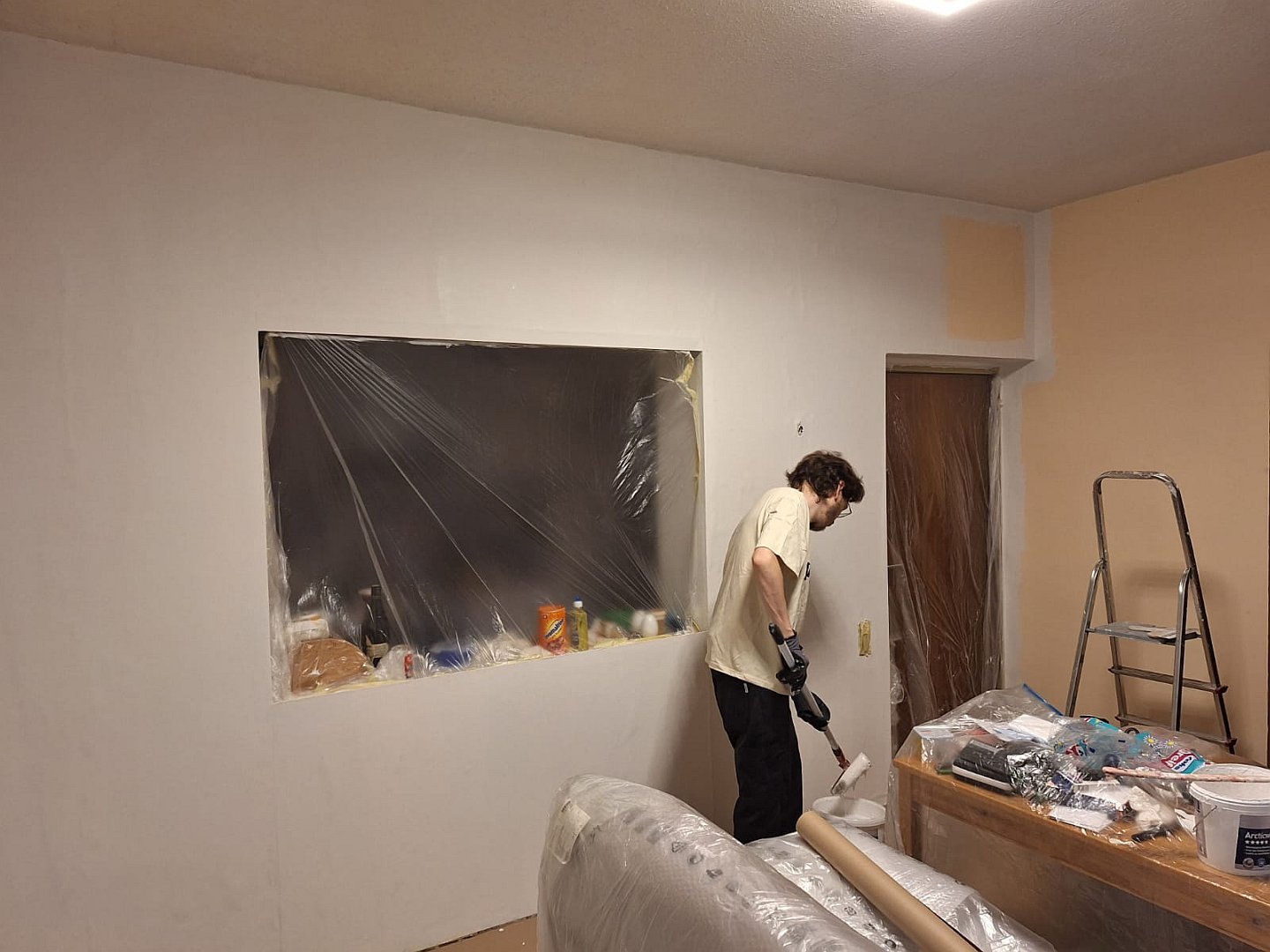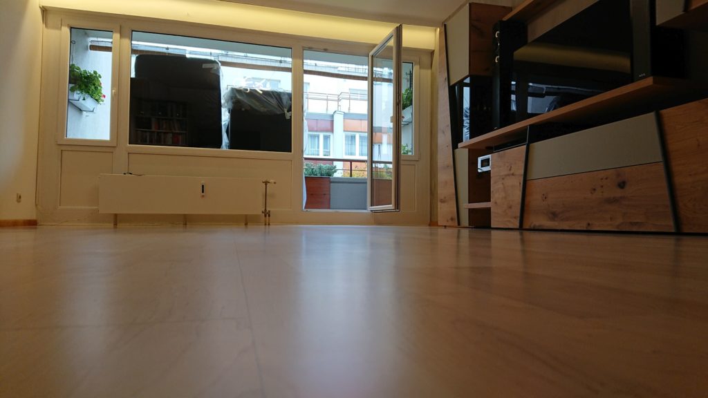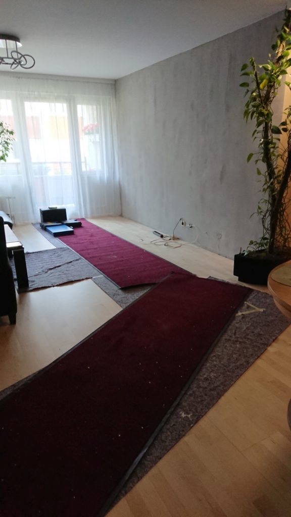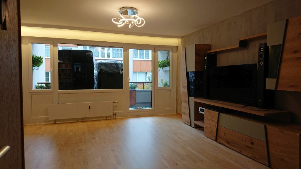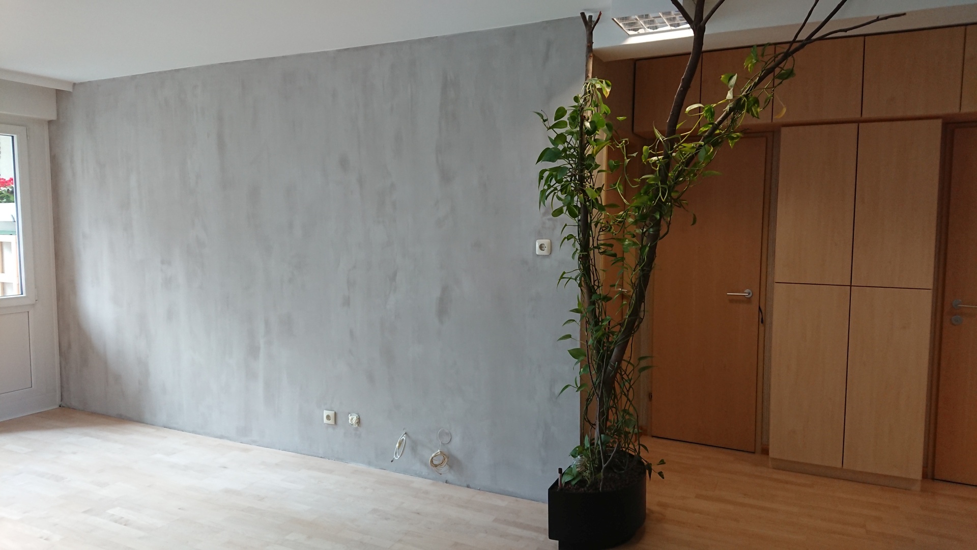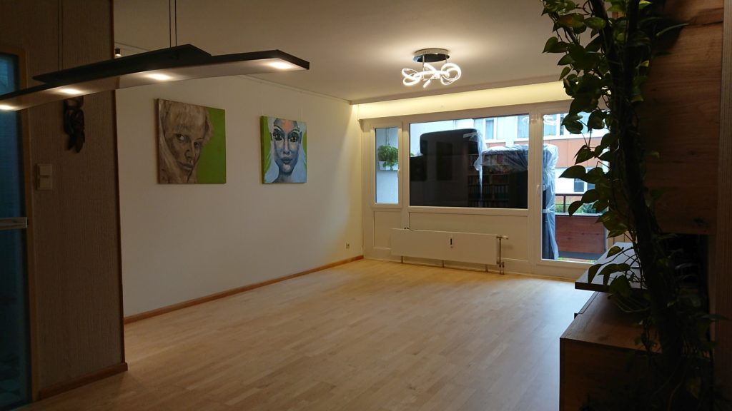 Die Firma Regner trat auf den Plan, packte alles fein säuberlich in Plastik ein, schliff und versiegelte den Boden und malte Wände und Decke an. Die „Verbau-Wand“ wurde mit einem Spezialanstrich in „Loft Optik“ versehen.