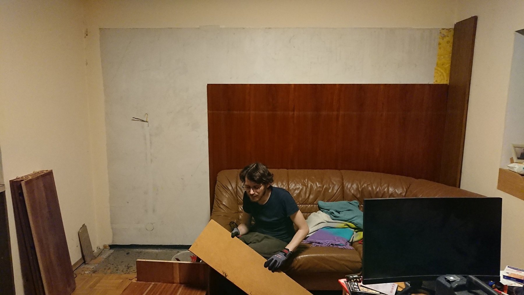 Der alte Kirschholz-Wandverbau, Baujahr 1986, wurde ausgeräumt, zerlegt und mit Hilfe des STYX-records-Auto entsorgt. Es blieb nur eine Skyline übrig.