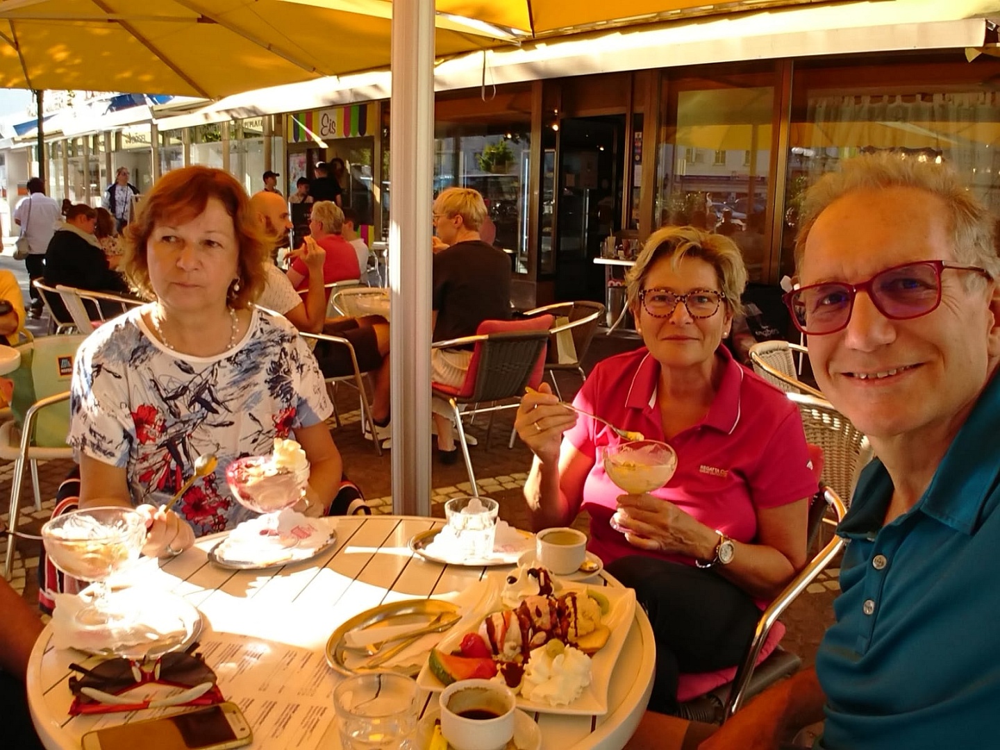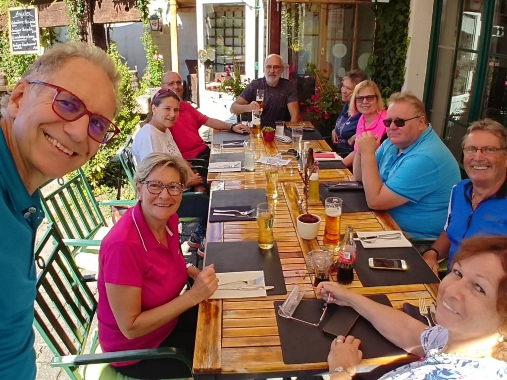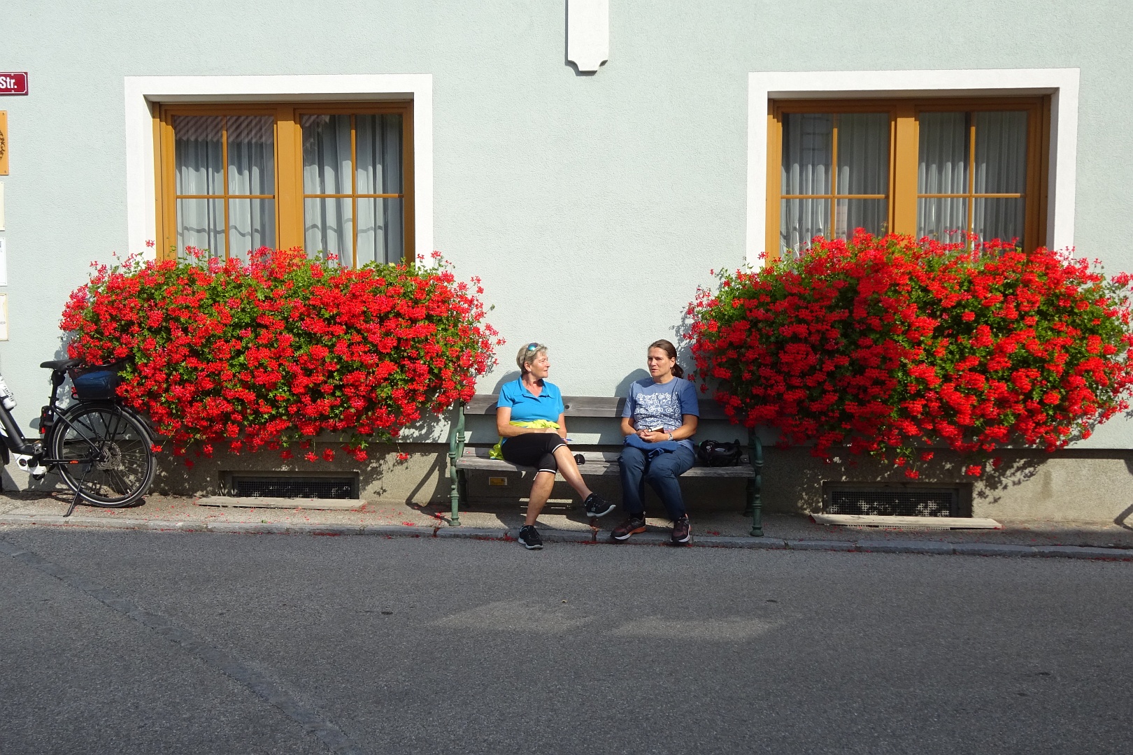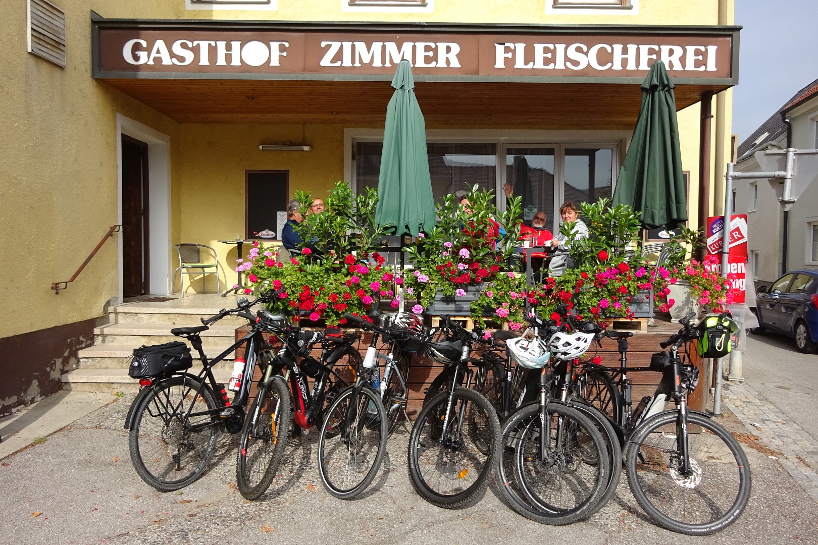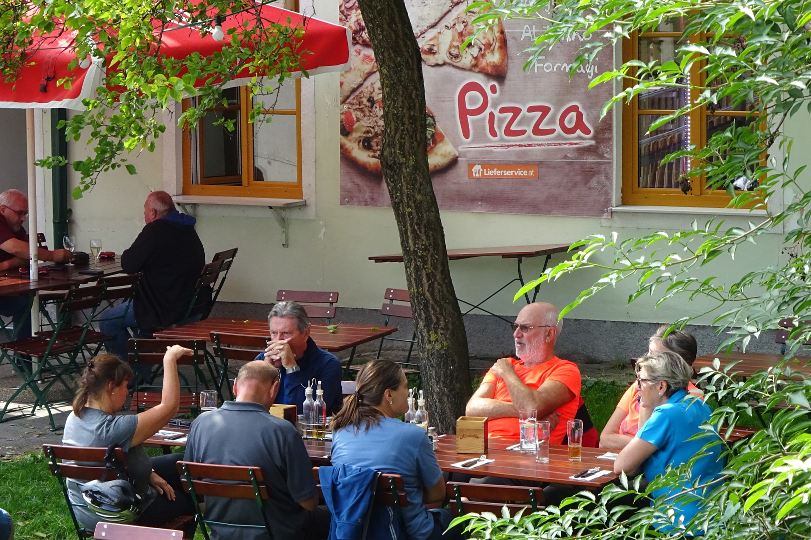 Andi war erwartungsgemäß bald unterhopft und wir machten einen Zwischenstopp in Nussdorf im Gashaus Spannagl. Zwei Damen streikten und warteten am Bankerl in der Sonne. Zu Mittag hatten wir nichts reserviert und alle schönen Locations sind hoffnungslos überfüllt. Wir landeten in Treismauer beim Römertor in einer Pizzeria mit Kebab und Burgern.