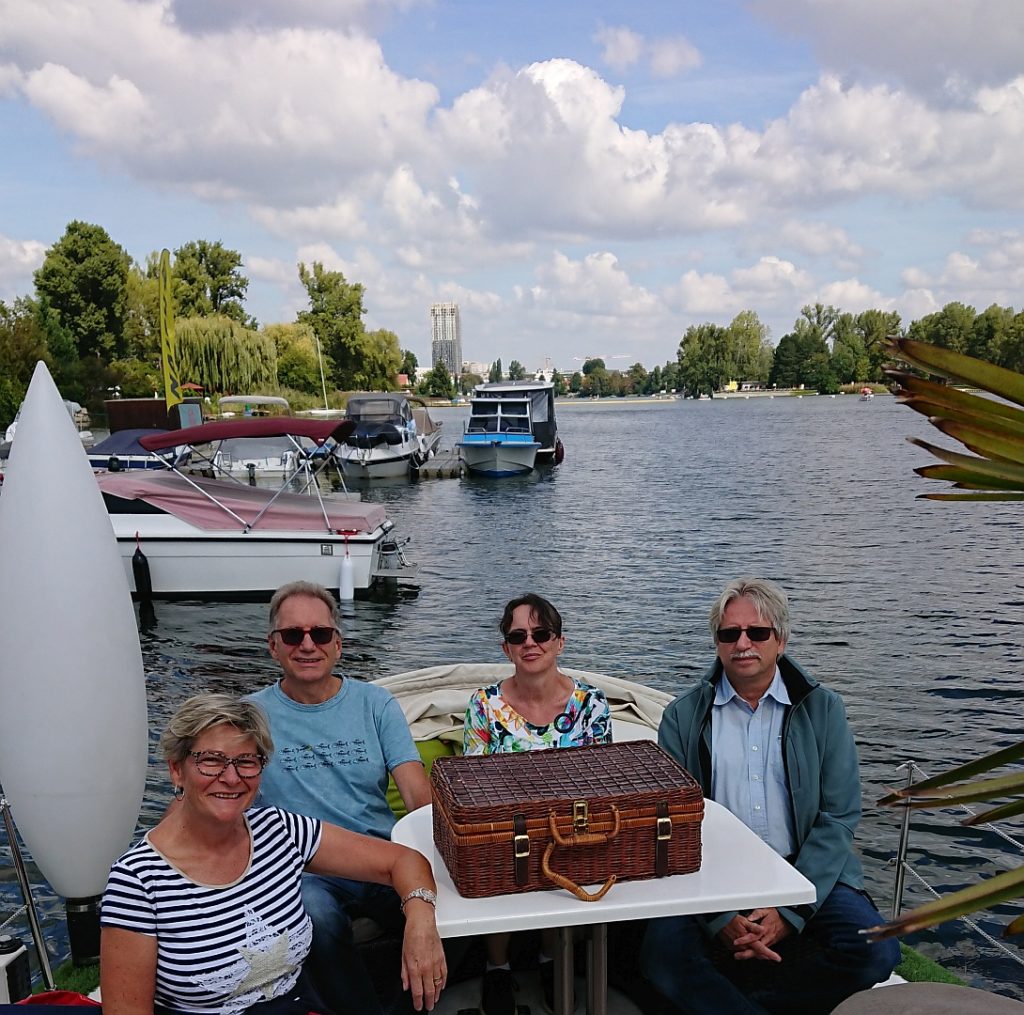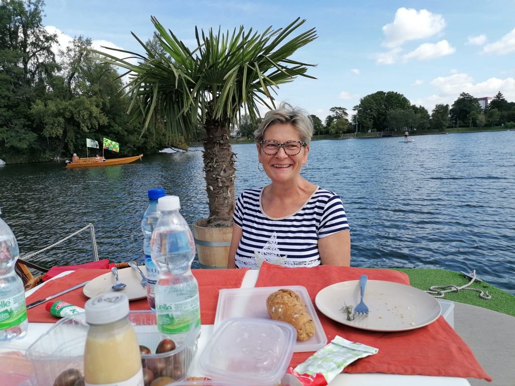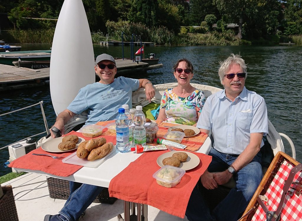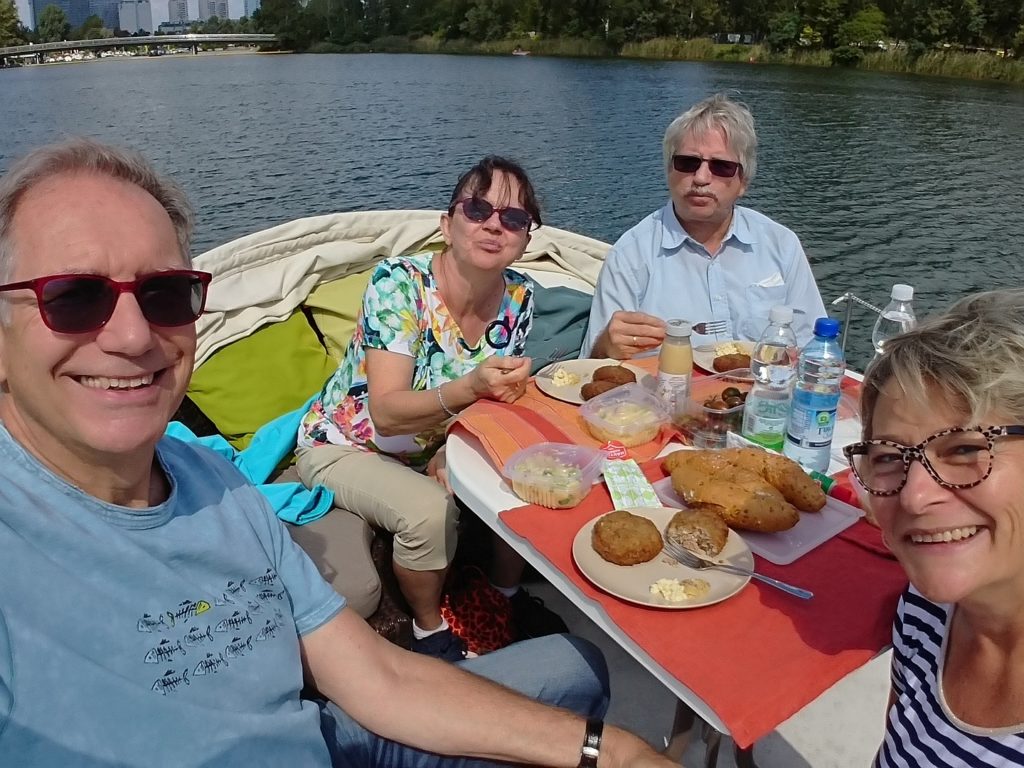 Witterungsbedingt starteten wir schon zu Mittag. An Board gabs Fleischlabern und Erdäpfelsalat, aber natürlich haben wir mit Frizzy angestoßen!
