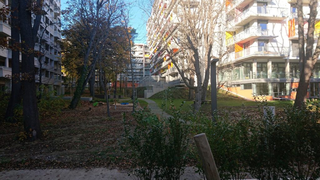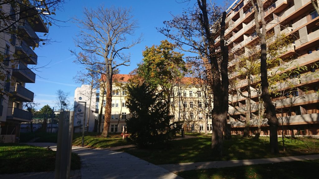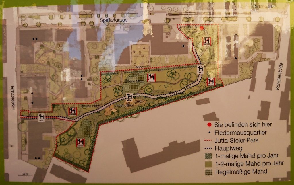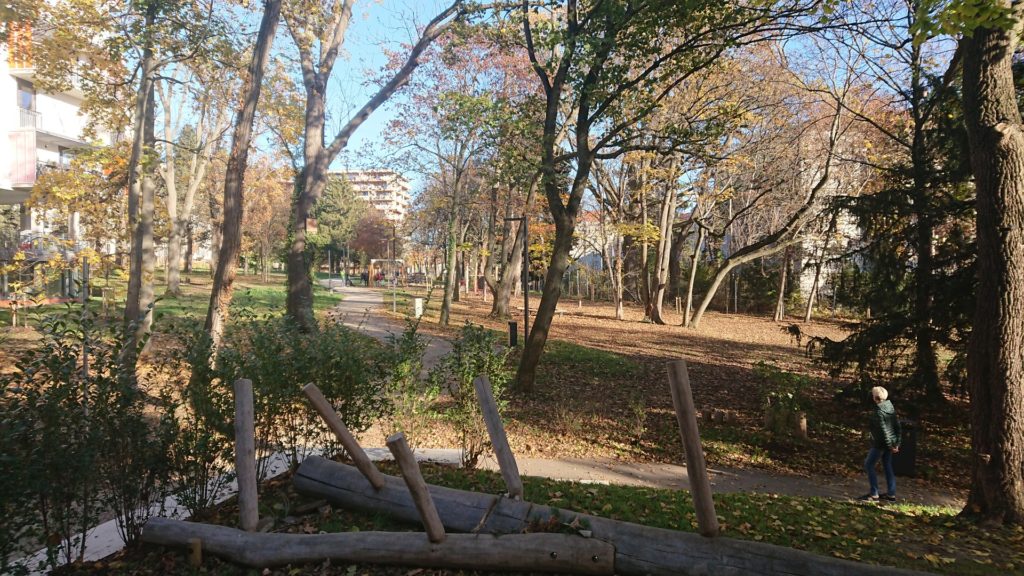 Es war natürlich ein sehr kurzer Ausflug in die Umgebung, aber einerseits waren die neuen Häuser in der Leyserstraße und Spallartgasse bedrohlich present, und andererseits stand in der Bezirkszeitung etwas von „schönem, alten Baumbestand“ im Jutta-Steirer Park.