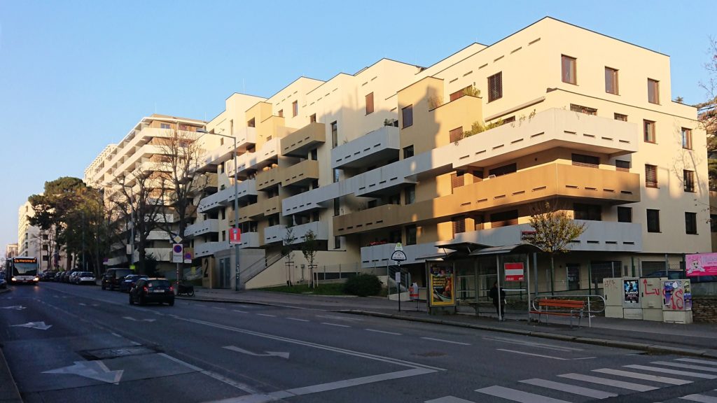 Vor allem das Eckhaus Leyserstraße / Hütteldorfer Straße erinnert mich immer an Indianer-Pueblo-Bauten. Die Bäume an der Straße und im Häuserzwischenraum machen auch keinen glücklichen Eindruck und so waren wir dann sehr gespannt auf den „Park“.