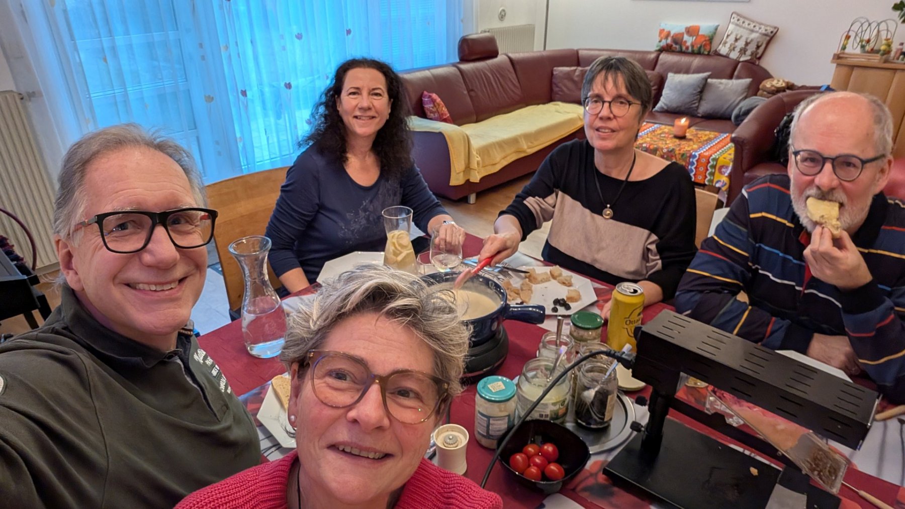 Dann war Käsefondue angesagt, zur Abwechslung mit einer fertigen, schweizer Fonduemischung. Die war letztlich (nach Ergänzung mit etwas Wein und Koblauch) gar nicht so schlecht. Zusätzlich gabs noch Racclette-Käse samt original Griller auf selbst gebackenem Weißbrot. Erwartungsgemäß kamen wir wie immer kalorisch auf unsere Rechnung. Die Torte war eine Co-Produktion von Ilona und Raffi. Danach spielten wir noch ausgiebig Dixit.