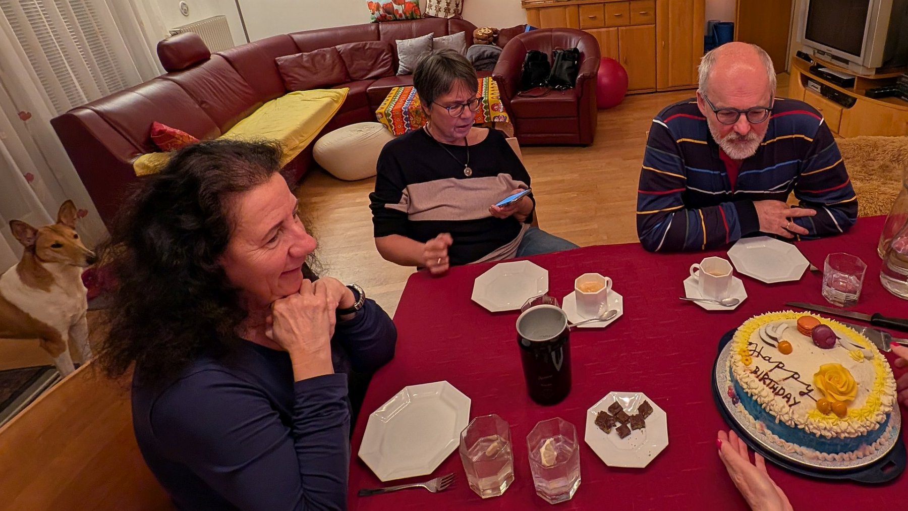 Ilona und Peter luden zur Geburtstagsfeier, aufgrund unlösbarer Hunde-Katzen-Probleme diesmal bei Ilona. Wir starteten aus verdauungstechnischen Gründen schon um 13:00 und sogar sportlich mit einem Spaziergang. D.h. ein bissl Vorglühen mit Punsch mussten wir schon. Die Stimmung war etwas frostig weil saukalt.