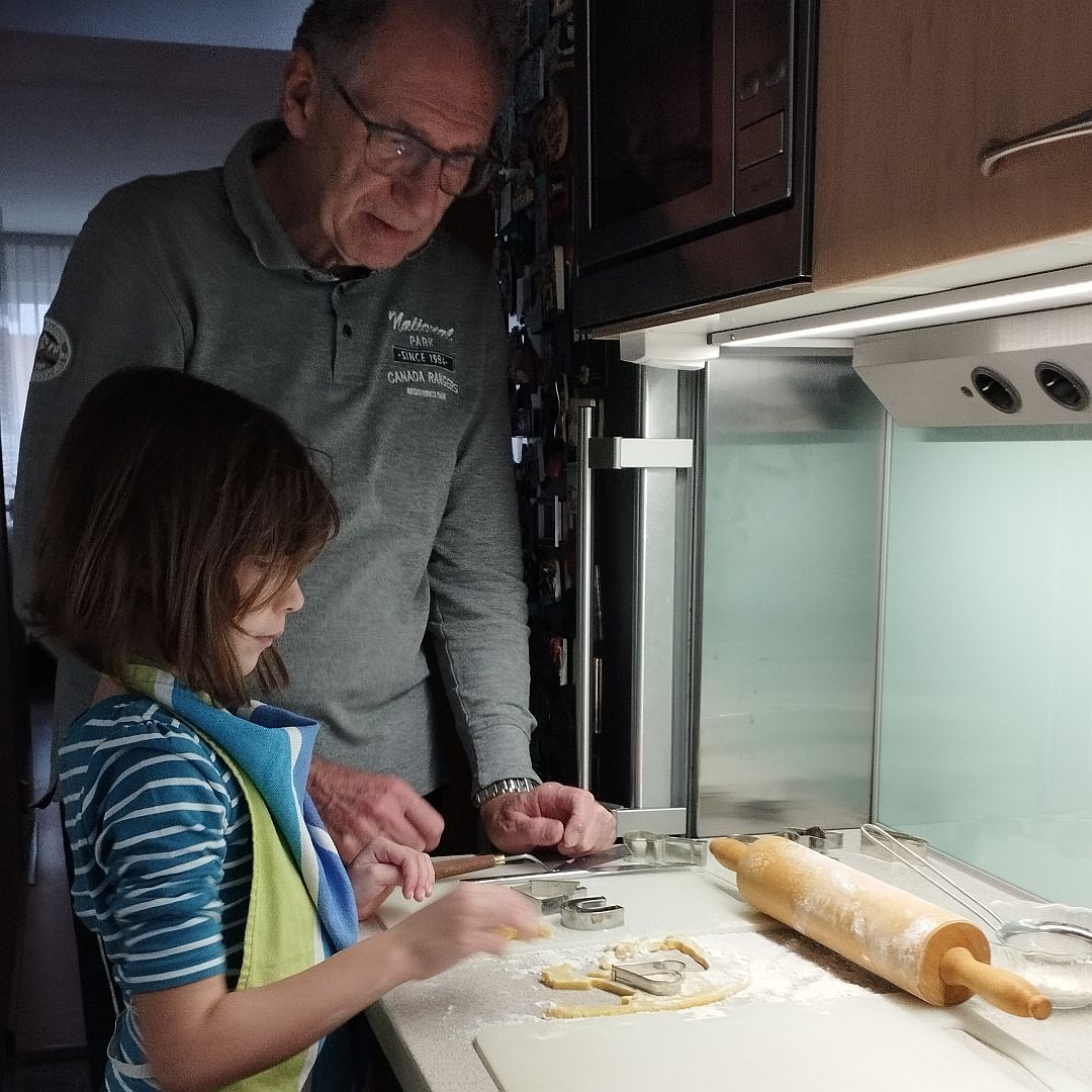Sieglinde holte Amelie vom Kindergarten ab und wir starteten gleich nach dem Essen mit der Kekserlwerkstatt. Amelie beeindruckte uns total mit konzentrierter, zielstrebiger Arbeit. Sie hat zwei Bleche Kekserln ausgewalkt, ausgestochen und nach dem Backen mit Schokolade verziert! Toll.
