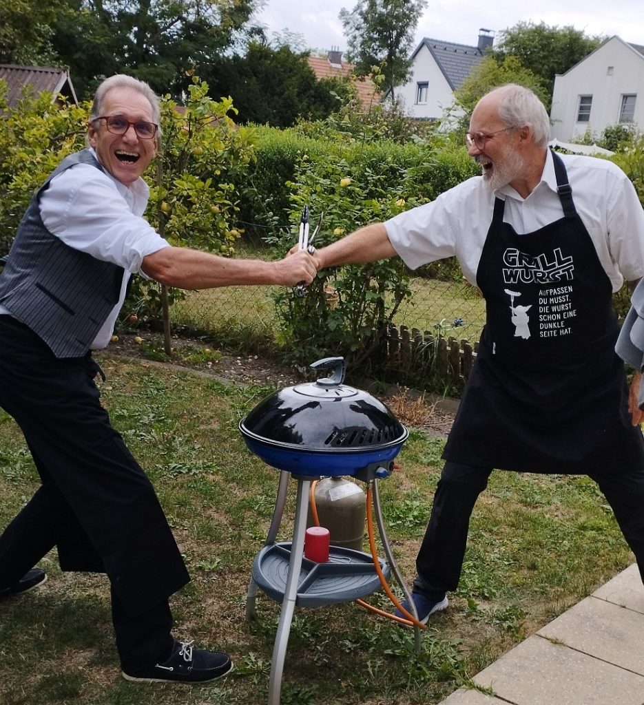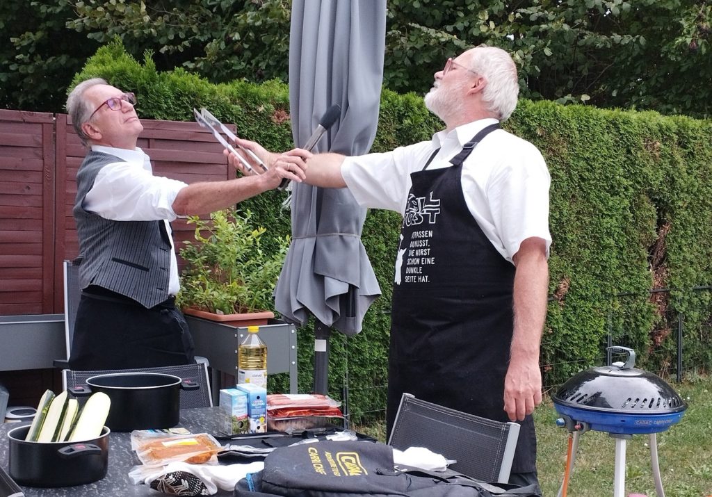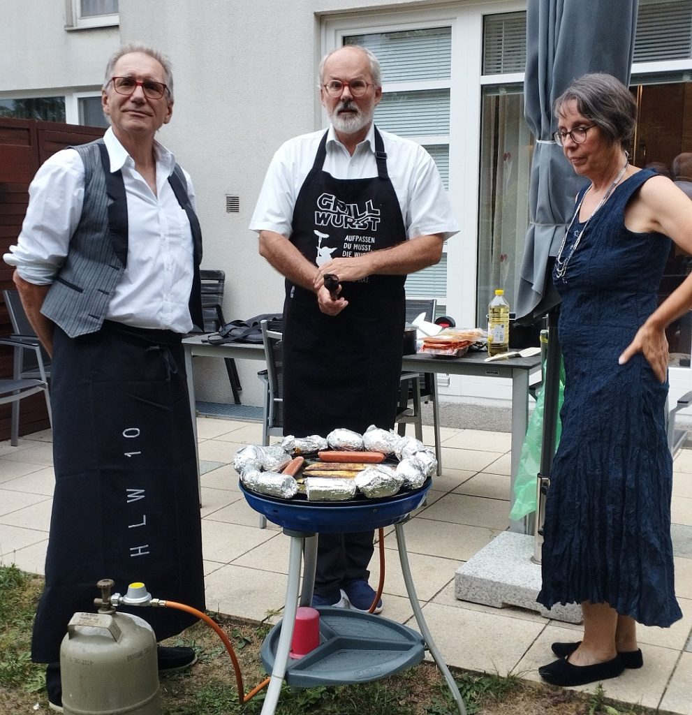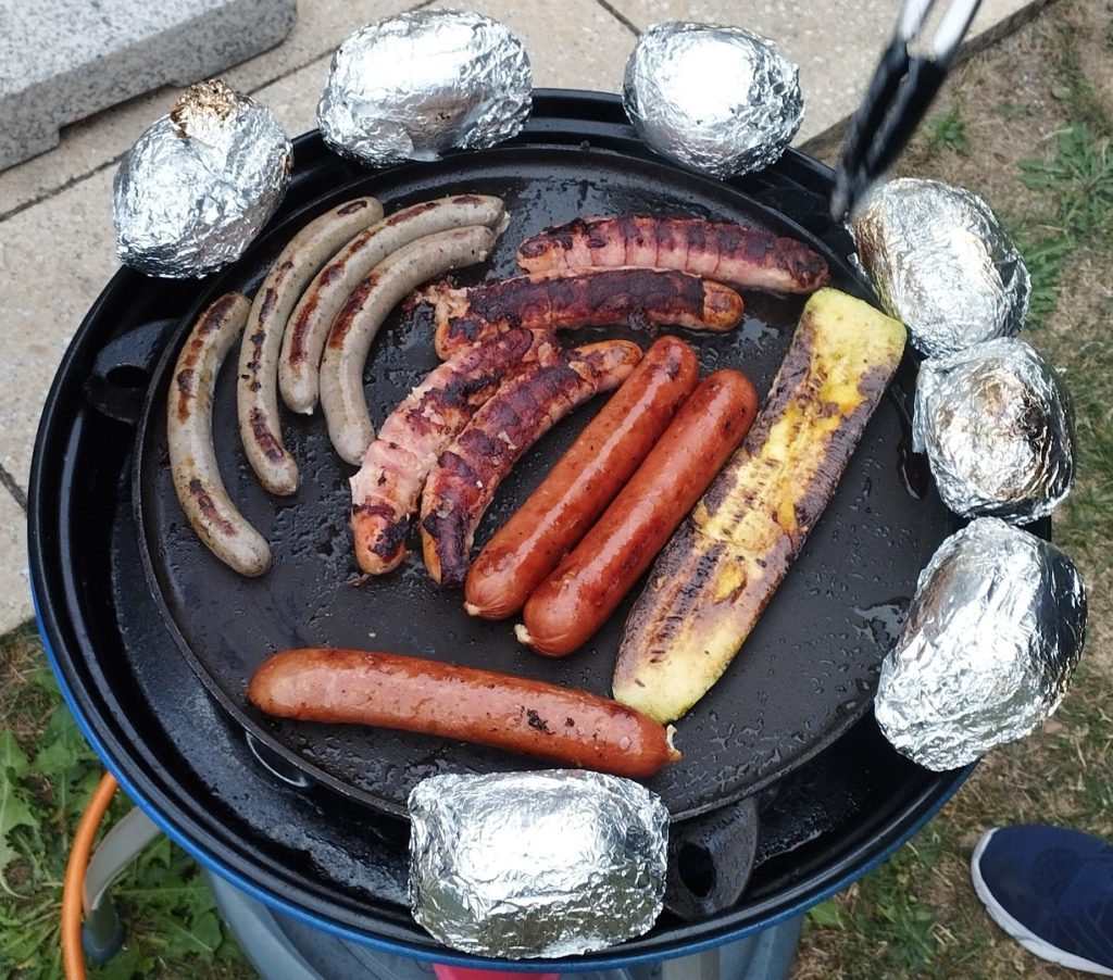 Zuerst wurde verkleidet, Jause gegessen (ich brachte ein Marillen-Tiramisu mit) und die erste Runde gespielt, dann wurde real gegrillt!