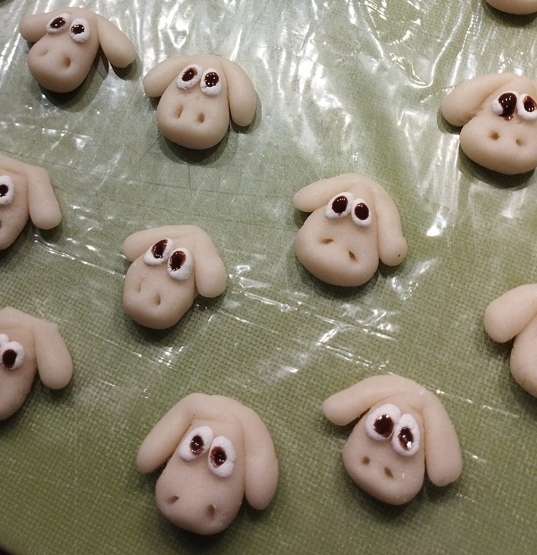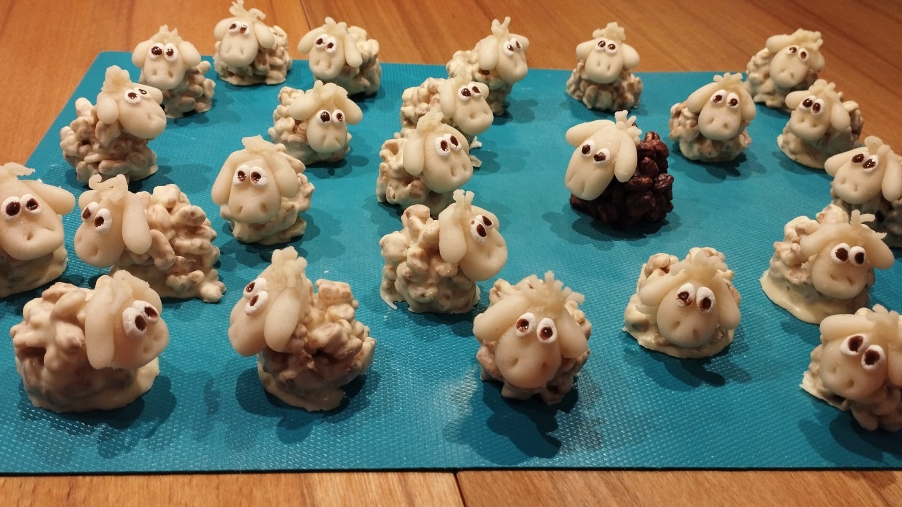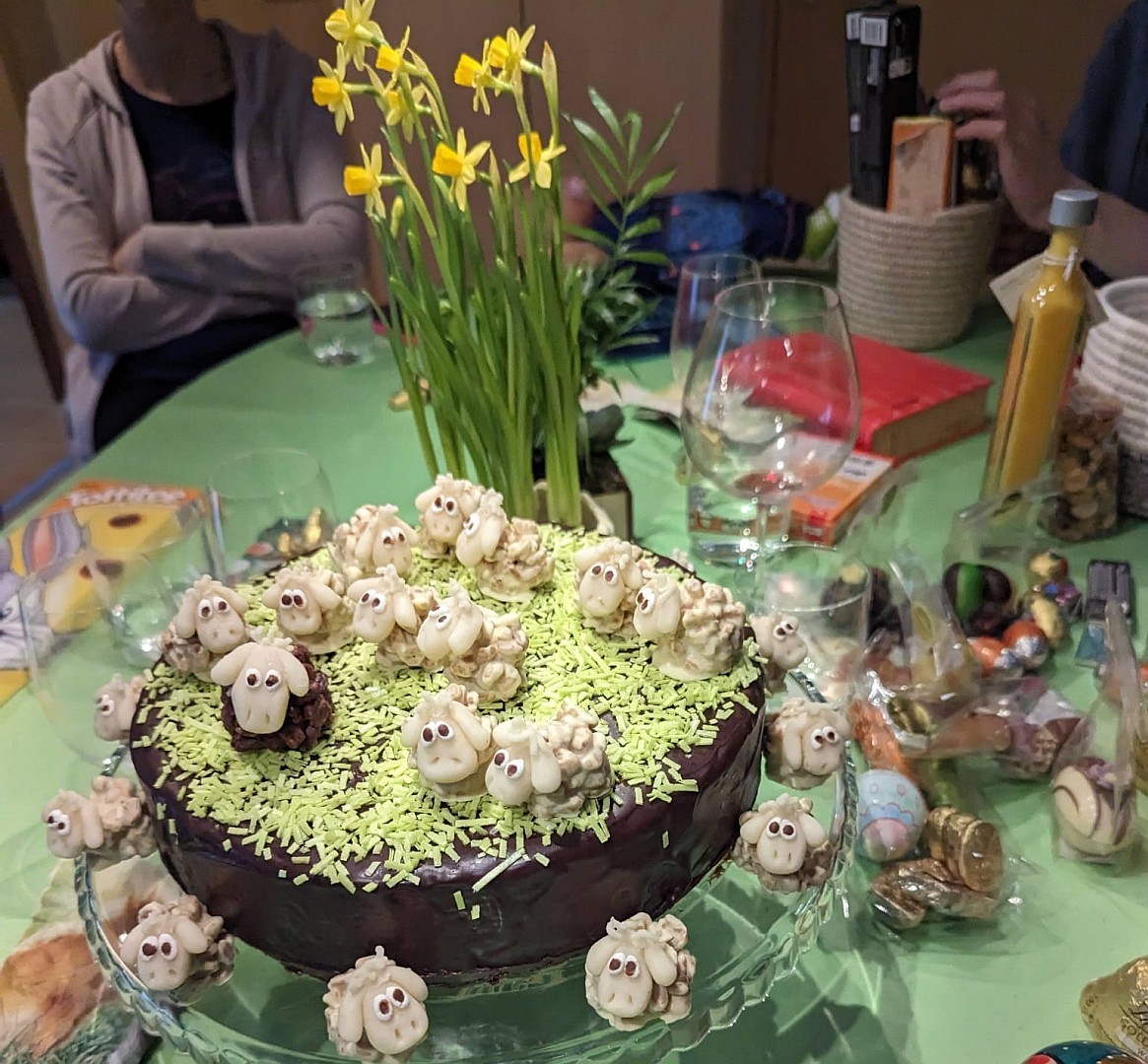 Zuerst haben wir in Serienproduktion Schafe gebastelt und eine Torte gebacken.