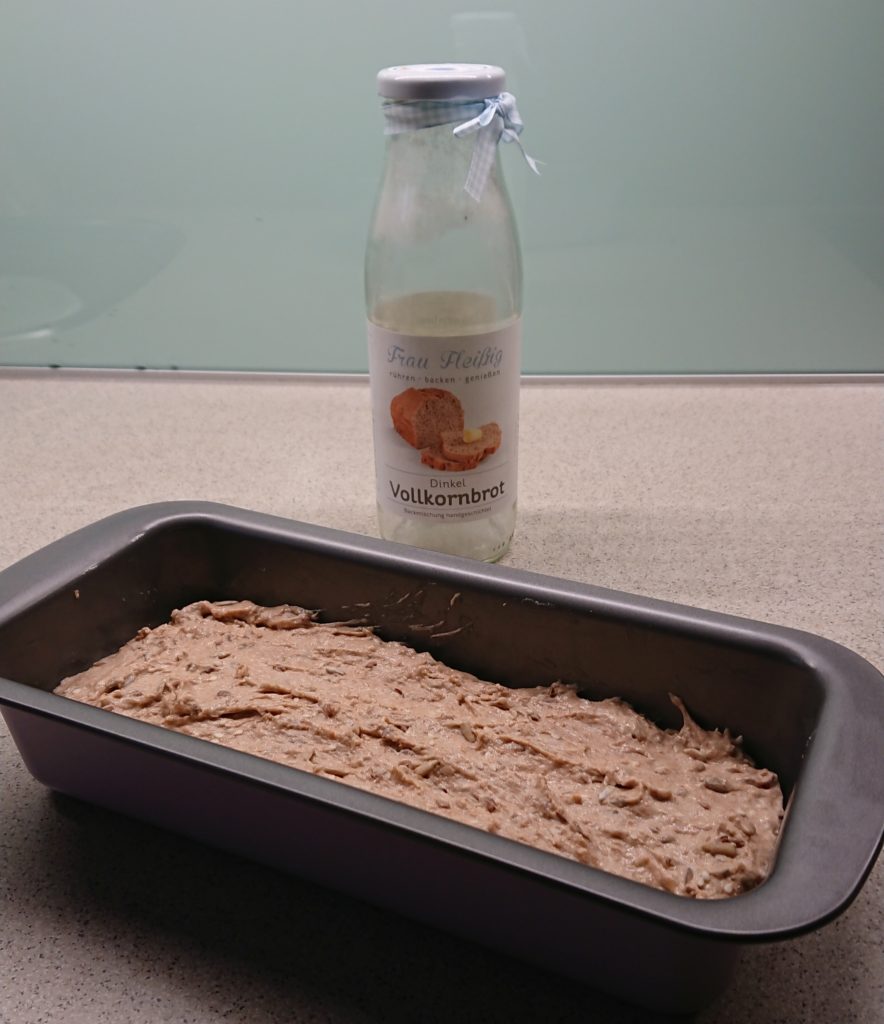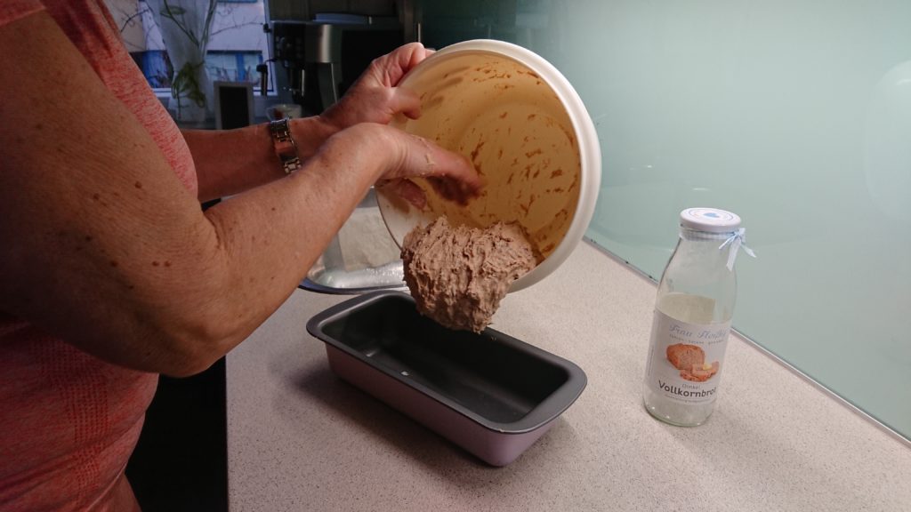 Am nächsten Tag waren wir ein bissl in Zeitdruck und haben den fertig gekneteten Teig nur knapp eine Stunde Rasten lassen und dann in die Kastenform gefüllt.