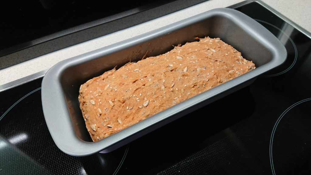 Die Backform ist mit dem rohen Teig gestrichen voll geworden. Das Brot ist schön aufgegangen und knackt beim drücken.