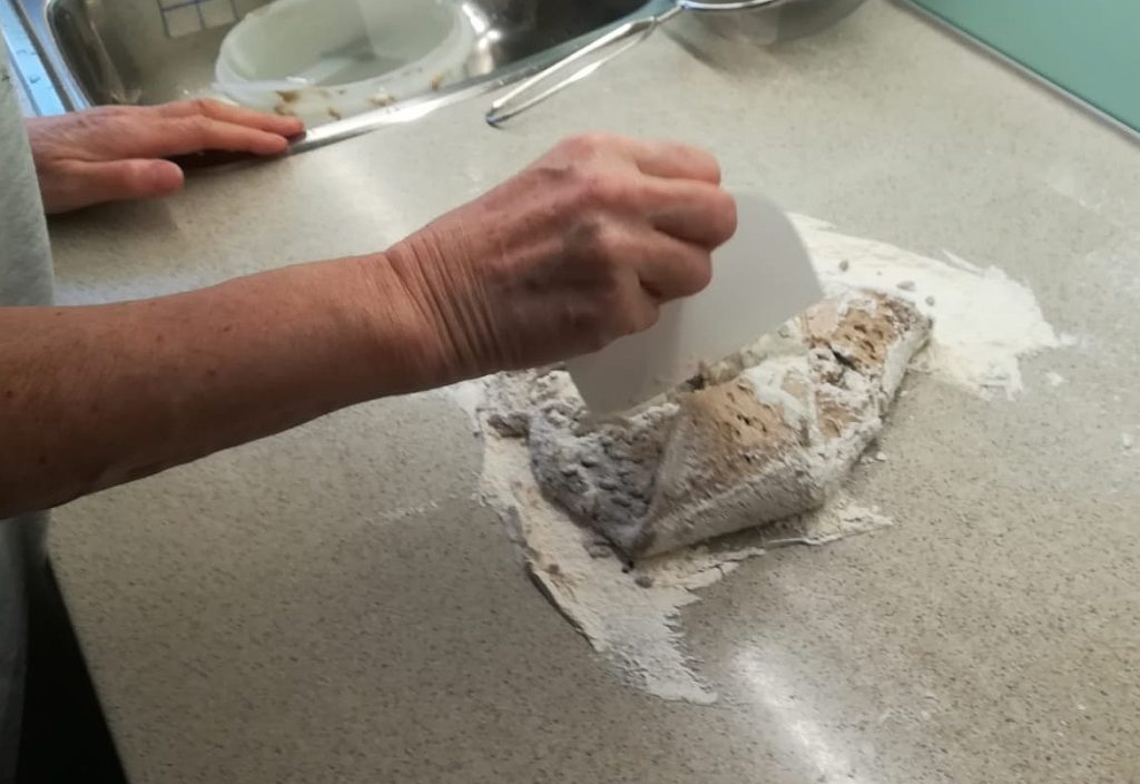Mit viel Mehl ausstauben, damit möglichst nix kleben bleibt.
