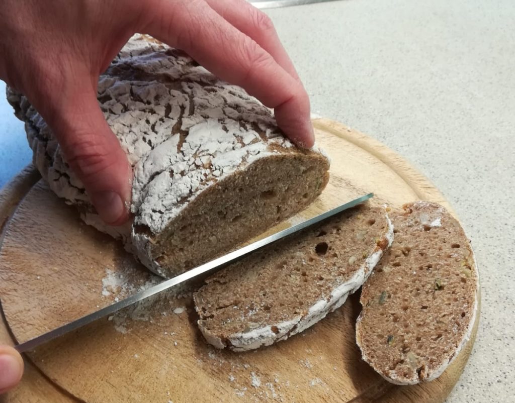 Das Brot ist schön aufgegangen, aber nicht wild aufgeplatzt, sondern rundherum gleichmäßig aufgerissen.