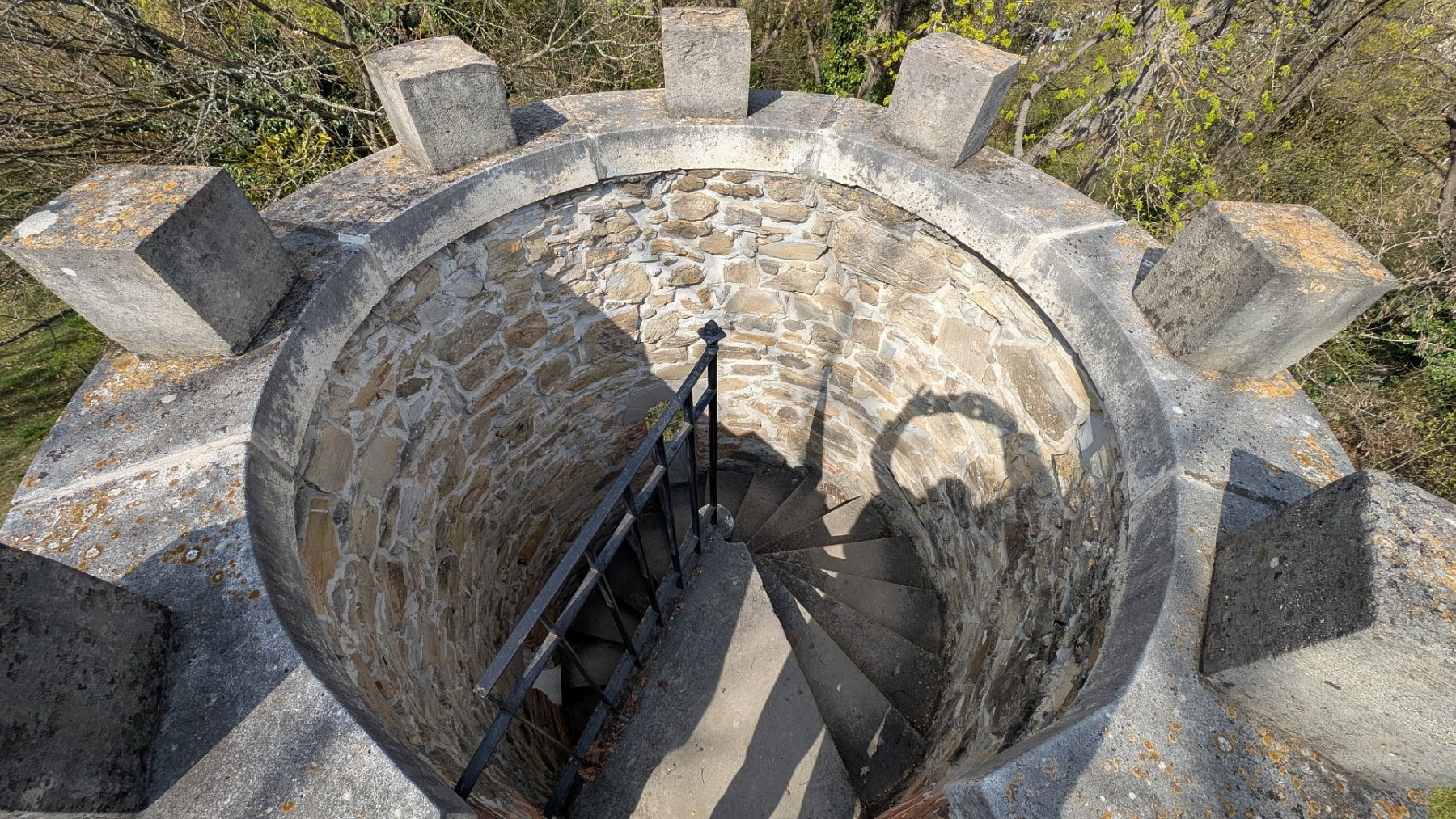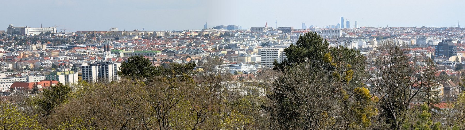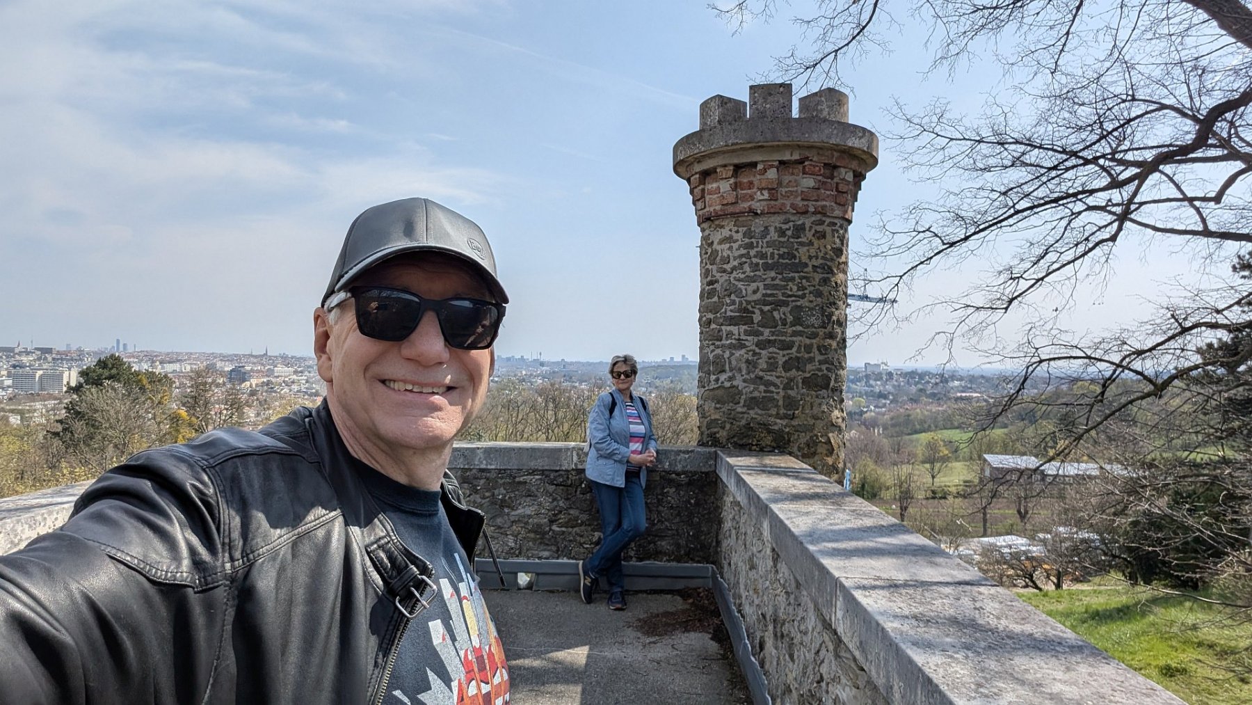 Premreinergasse, Testarellogasse. Von der Gärtnerei, wo ich damals Spielkameraden hatte, ist kaum etwas übrig, das Auhof-Kino ein Billa, der Streckerpark ordentlich eingezäunt. Ich gehe die Diabelligasse bergauf, erinnere mich, dass ich das Grab des Musikalienverlegers und Komponisten, nach dem die Gasse benannt ist, bald wieder besuchen muss, nämlich wenn am St.Marxer Friedhof der Flieder blüht. Wähle die Glasauergasse, um zu meiner ehemaligen Volksschule an der Hietzinger Hauptstraße zu kommen und nehme die Einsiedeleigasse hinauf Richtung Girzenberg. Es gibt einen Grund, warum ich durch mein Ober St. Veit streife. Ich habe die Information aufgeschnappt, dass es hier einen kleinen Aussichtsturm geben soll, von dem ich freilich noch nie etwas gehört habe: die Aussichtswarte Trazerberg. Nun sind meine Spaziergänge ja darauf ausgelegt, Expeditionen in die Nähe zu unternehmen und interessante Dinge aufzuspüren, die man vielleicht jahrzehntelang übersehen hat. Eine Aussichtswarte wäre allerdings ein ziemlich großes, interessantes und gleichzeitig übersehenes Ding, deshalb gehe ich auch so aufmerksam die Einsiedeleigasse bergauf und versuche, zwischen den Häusern auf der linken Straßenseite einen Blick auf ein Gebäude zu erhaschen, das sich vermeintlich dort befindet – mutmaßlich auf Höhe der Nummer 27. Aber außer einer Hausfassade und Bäumen sehe ich nichts. Also gehe ich weiter, bis die Angermayergasse nach links Richtung Trazerberg abbiegt. Dort befindet sich, in durchaus spektakulärer Lage, die Hochschule für Agrar- und Umweltpädagogik. Deren Tor steht – wiewohl es Sonntag ist- offen, und ich betrete den großen, ziemlich steil ansteigenden Garten, um die Warte aufzuspüren. Die Tatsache, dass sich „Aussichtspunkte gern auf Berg- oder Hügelkuppen befinden, erleichtert die Suche. Ich stapfe bergauf, vorbei an ein paar Skulpturen, und da steht sie tatsächlich, die Aussichtswarte. Aus Natursteinen gebaut, romanische Fensterbögen, ein kleines Türmchen wie ein schottisches Kastell, flankiert von mächtigen Bäumen. Glücklich umrunde ich das Fundstück, mannshohe Rundbögen auf der dem Wiental zugewandten Seite, der Stiegenaufgang offen, zum Glück. Oben angekommen öffnet sich ein spektakulärer Blick über die Stadt, von den donaunahen Wolkenkratzern am Horizont bis zu den Türmen von Alt Erlaa, vom nahen Roten Berg zum Küniglberg und nach Schönbrunn. Ich bleibe sicher eine halbe Stunde, genieße die Aussicht, aber auch die schiere Existenz dieses versteckten Ortes. Dankbarkeit durchflutet mich, dass die Hochschule das Tor nicht schließt und neugierigen Passanten erlaubt, die Stadt von oben zu betrachten. Später gehe ich über den Roten Berg nach Unter St. Veit und von da nach Hietzing. Im Dommayer wartet eine Schweizer Apfeltorte auf mich. Der Spaziergang – vor allem sein geografischer wie emotionaler Höhepunkt – hat mich zutiefst beglückt. Ich werde wiederkommen – und hoffen, dass das Tor noch immer offen ist.
