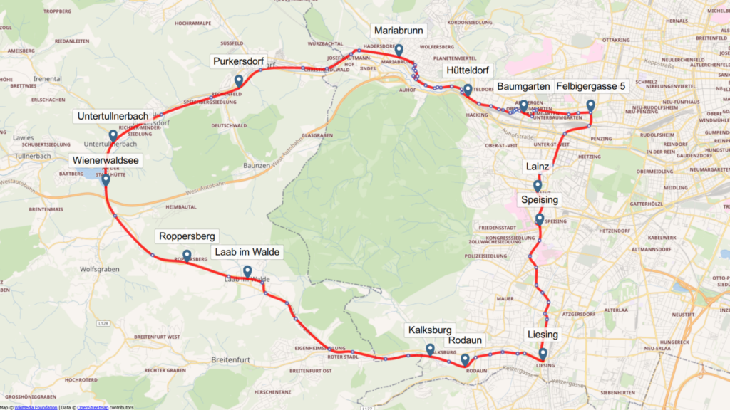 Liesing – Laab im Walde – Wienerwaldsee – Purkersdorf – Hütteldorf – Penzing gewählt.