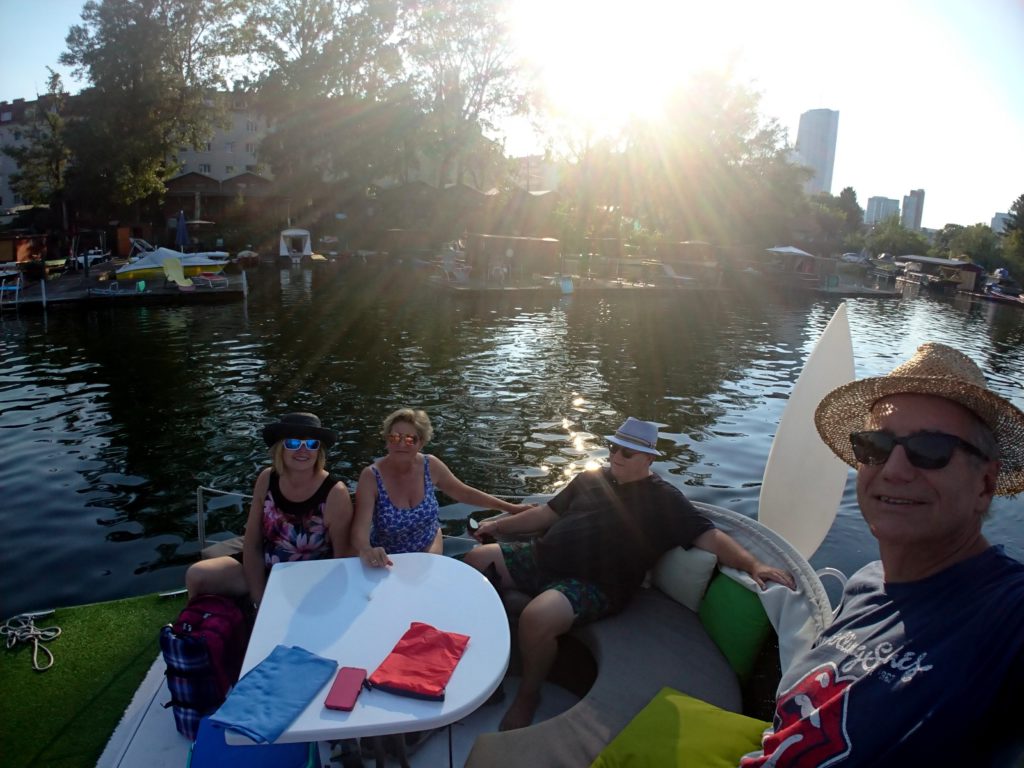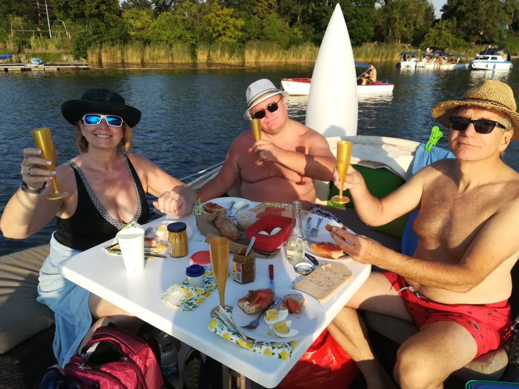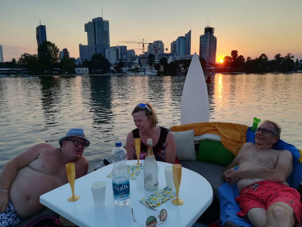 Eigenlich hätte es eine Mondscheinfahrt mit Monika und Andi werden sollen, aber der Vollmondtermin war voll verregnet! wir konnten kurzfristig einen Ersatztermin buchen. Es gab zwar keinen Vollmond mehr, aber perfektes Badewetter und einen schönen Sonnenuntergang.