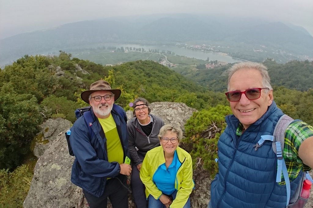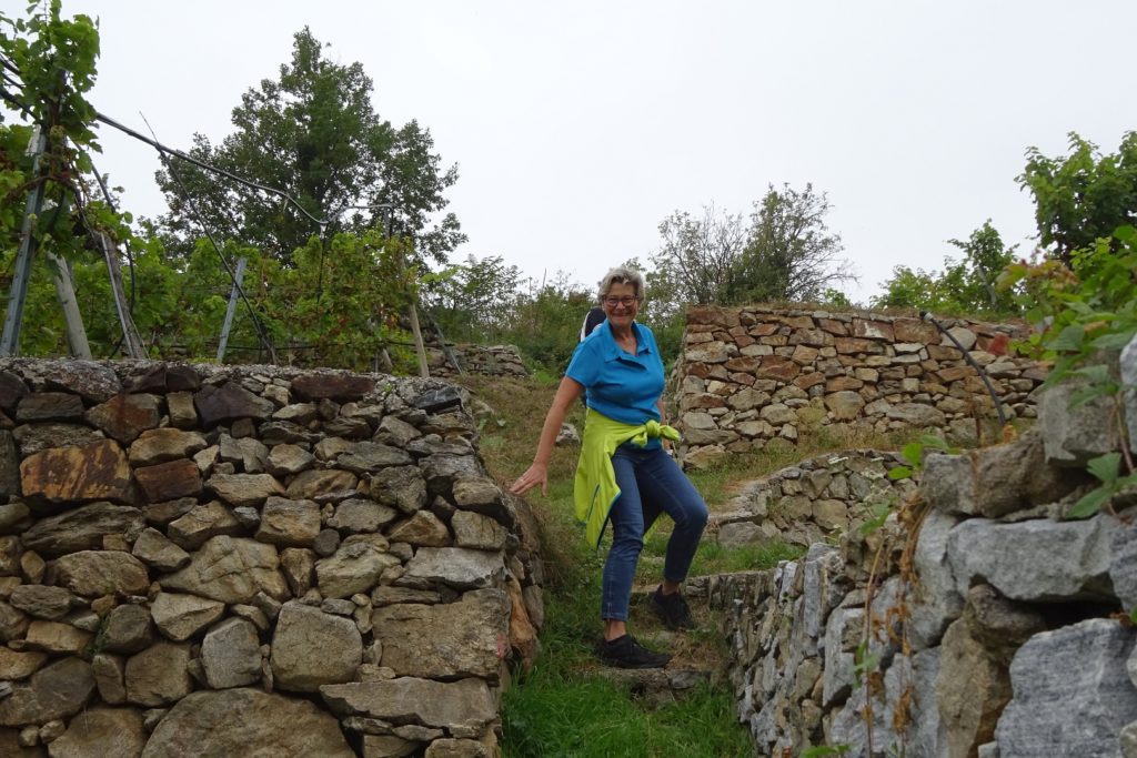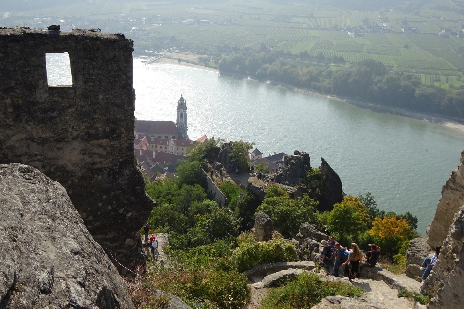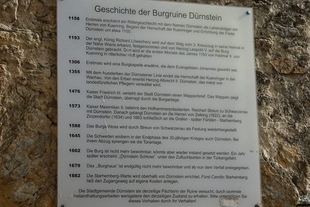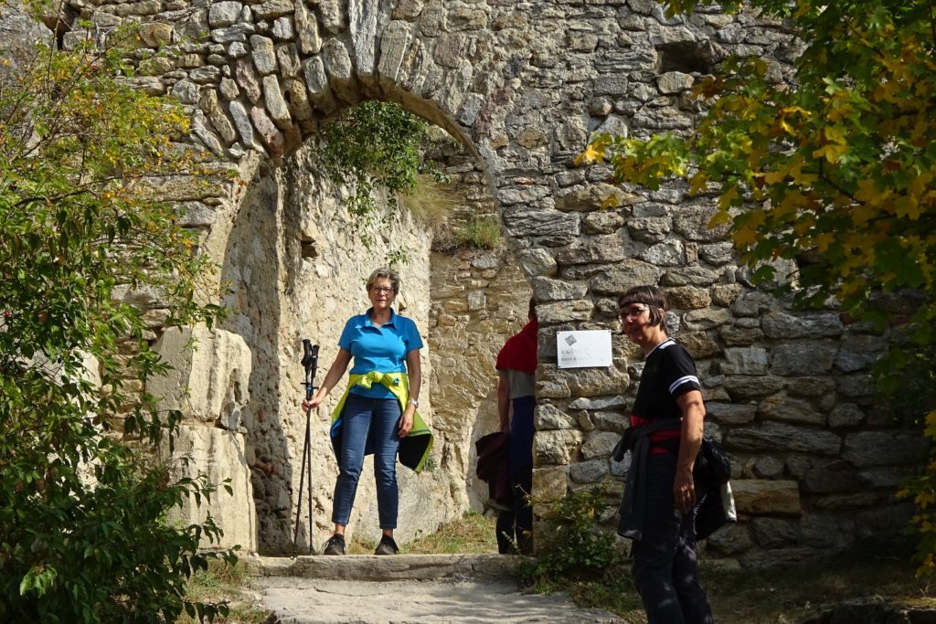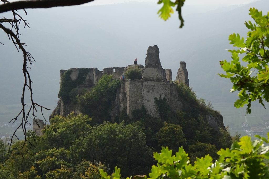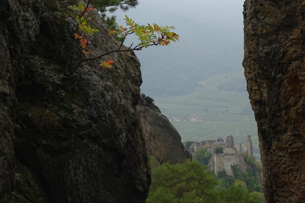 Viel zu schnell für unseren Zeitplan waren wir wieder beim Franzosendenkmal angekommen und daher beschlossen wir, nicht direkt nach Dürnstein weiter zu gehen, sondern noch einen Abstecher zur Ruine zu machen. Dieser Weg führte uns dann aber querfeldein durch die Weinberge zur Mariandl-Aussicht und über weitere Kanzeln, bis wir endlich bei der Ruine Dürnstein ankamen.