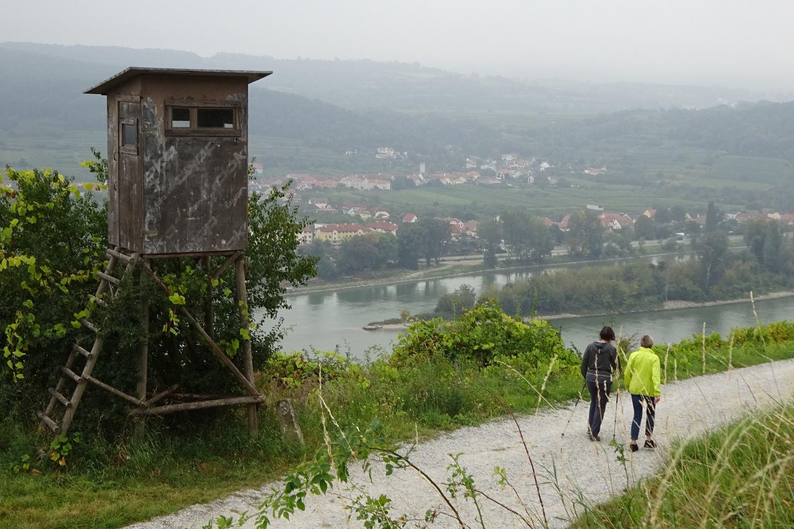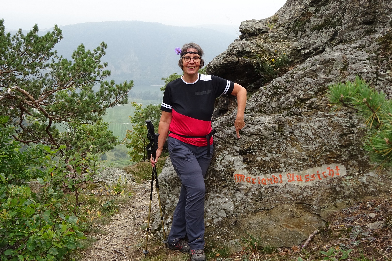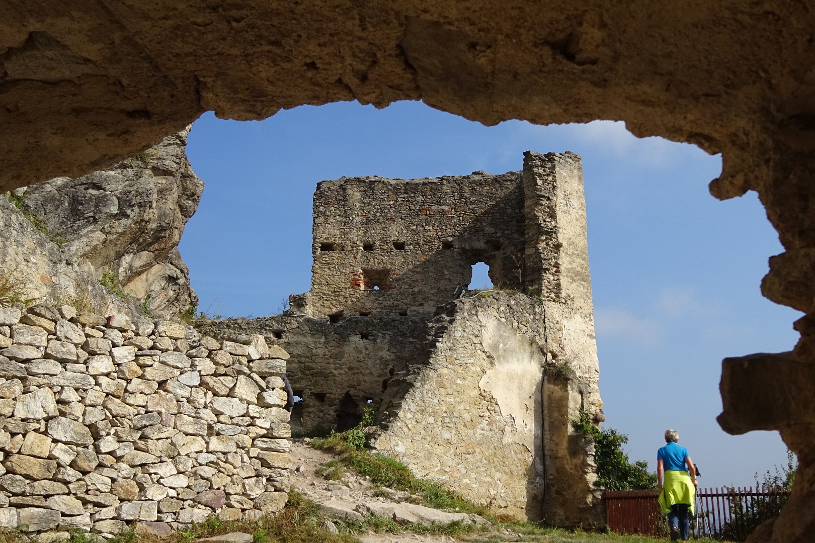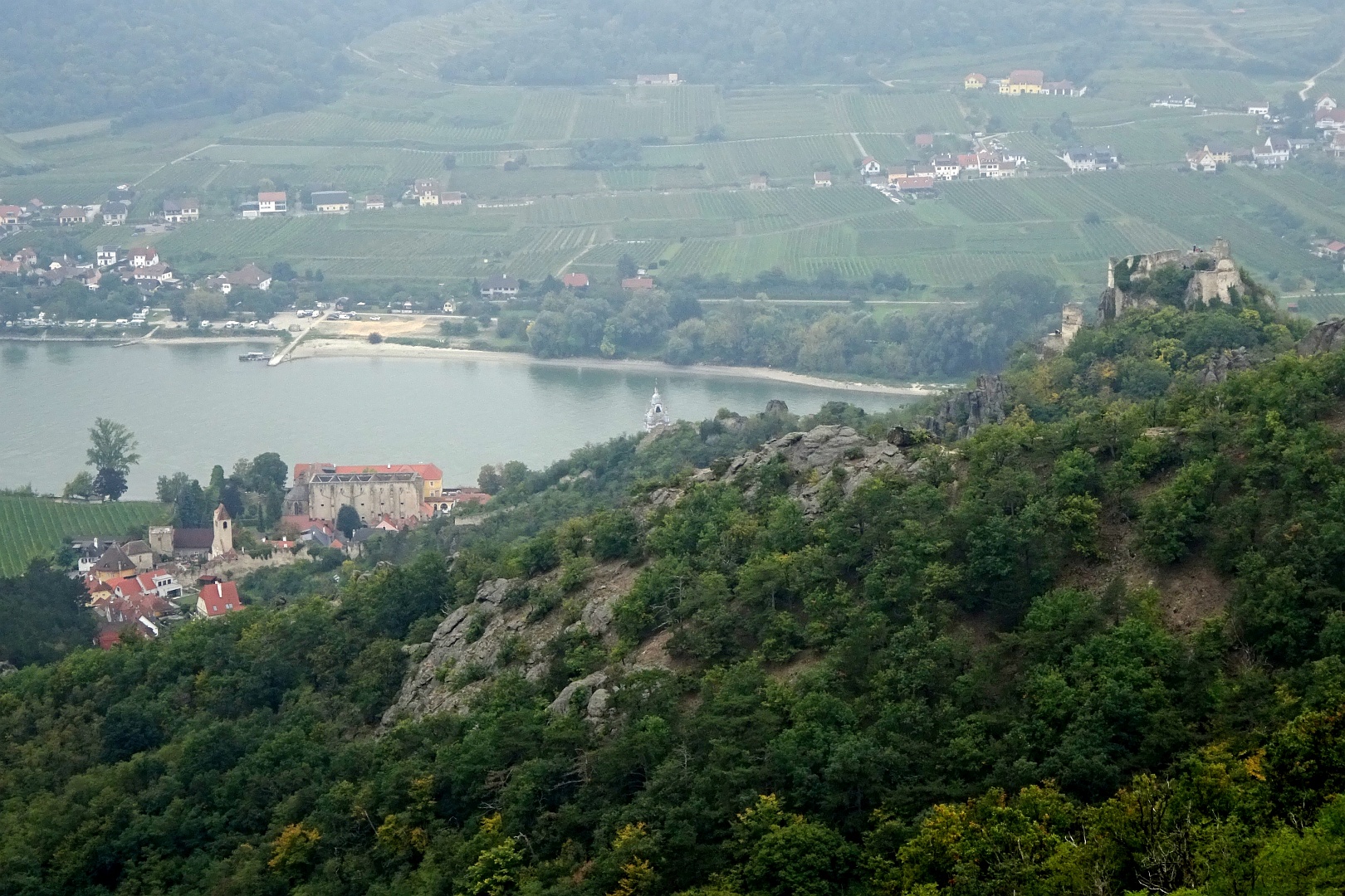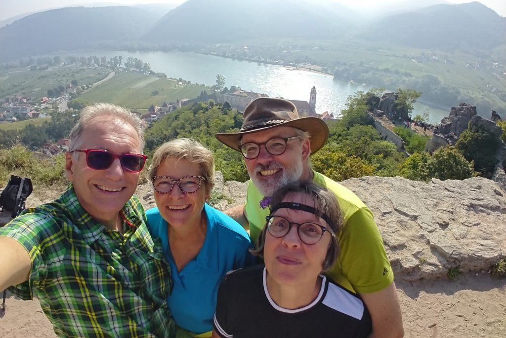 Viel zu schnell für unseren Zeitplan waren wir wieder beim Franzosendenkmal angekommen und daher beschlossen wir, nicht direkt nach Dürnstein weiter zu gehen, sondern noch einen Abstecher zur Ruine zu machen. Dieser Weg führte uns dann aber querfeldein durch die Weinberge zur Mariandl-Aussicht und über weitere Kanzeln, bis wir endlich bei der Ruine Dürnstein ankamen.