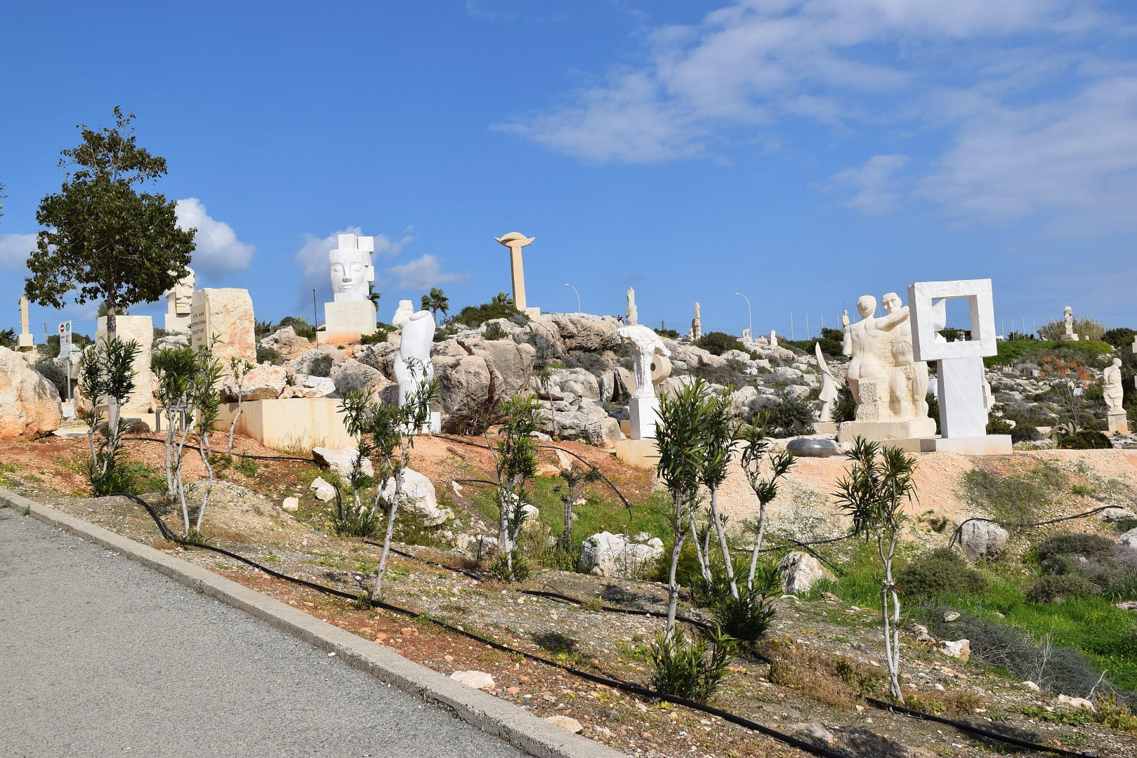 12. Tag – an unser letzter Tag mit dem Mietauto zur Ayia Thekla Kapelle, zur Steinernen Brücke, zu den Cyclops Caves von Kap Greco und nach Ayia Napa. Außer einem wegen Renovierung geschlossenem Kloster auch ein 600 Jahre alten Baum und ein Skulpturenpark. Allerdings ist im Februar in Ayia Napa ziemlich tote Saison.